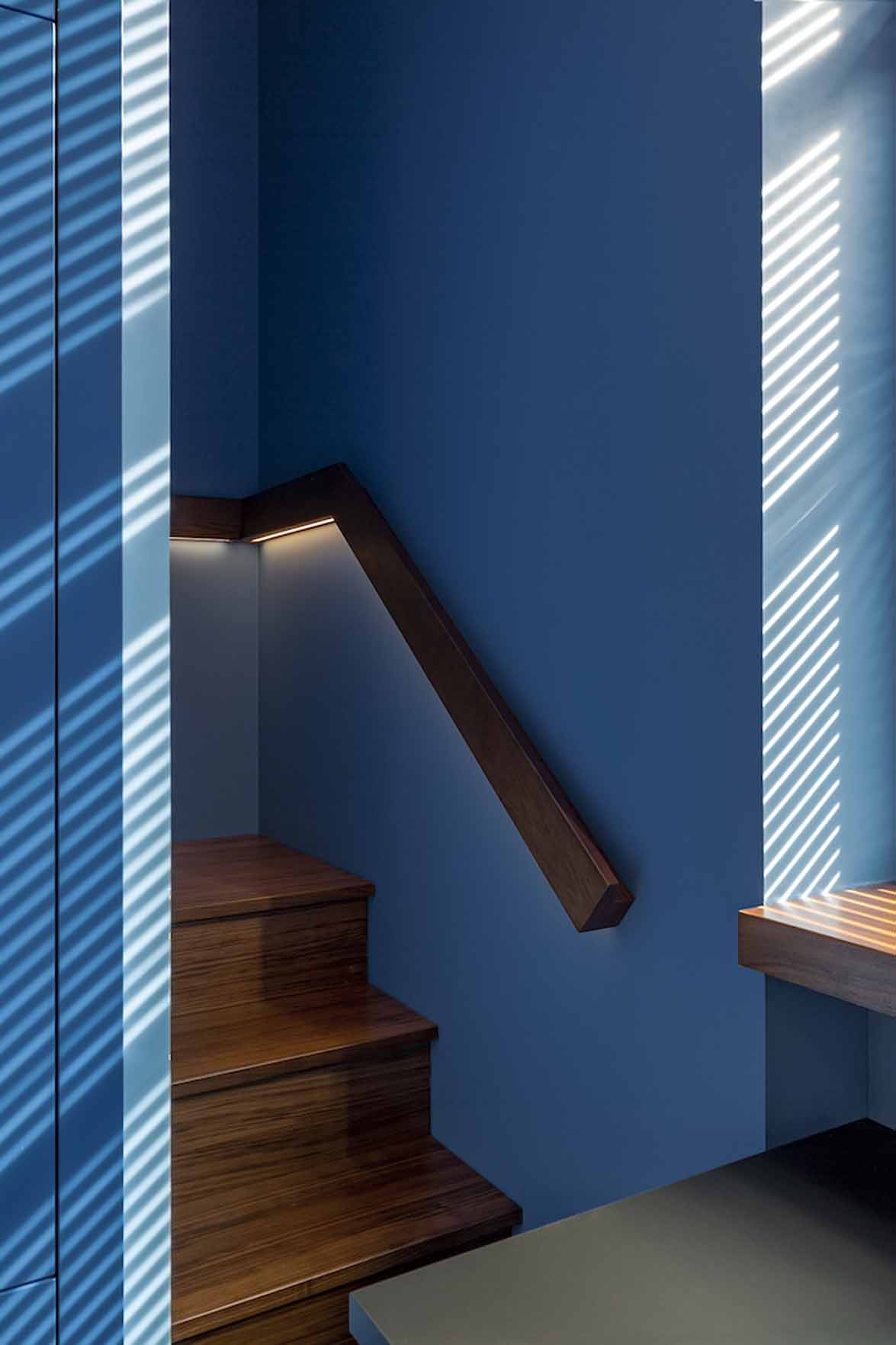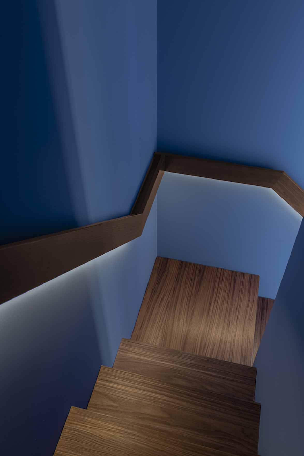 A galériaszintre vezető lépcső kialakítása valódi építészeti fejtörő volt. A tervező a hálószoba fala mögé rejtette a feljárót, így vizuálisan megőrizte az alsó szint egységét. A galériaszint modern, áramvonalas korlátja és az üvegfelületek használata tovább erősíti a tér légiességét. A tárolást beépített szekrényekkel oldották meg, amelyek a falakkal azonos színt kaptak, így szinte észrevétlenül simulnak a falakba.
