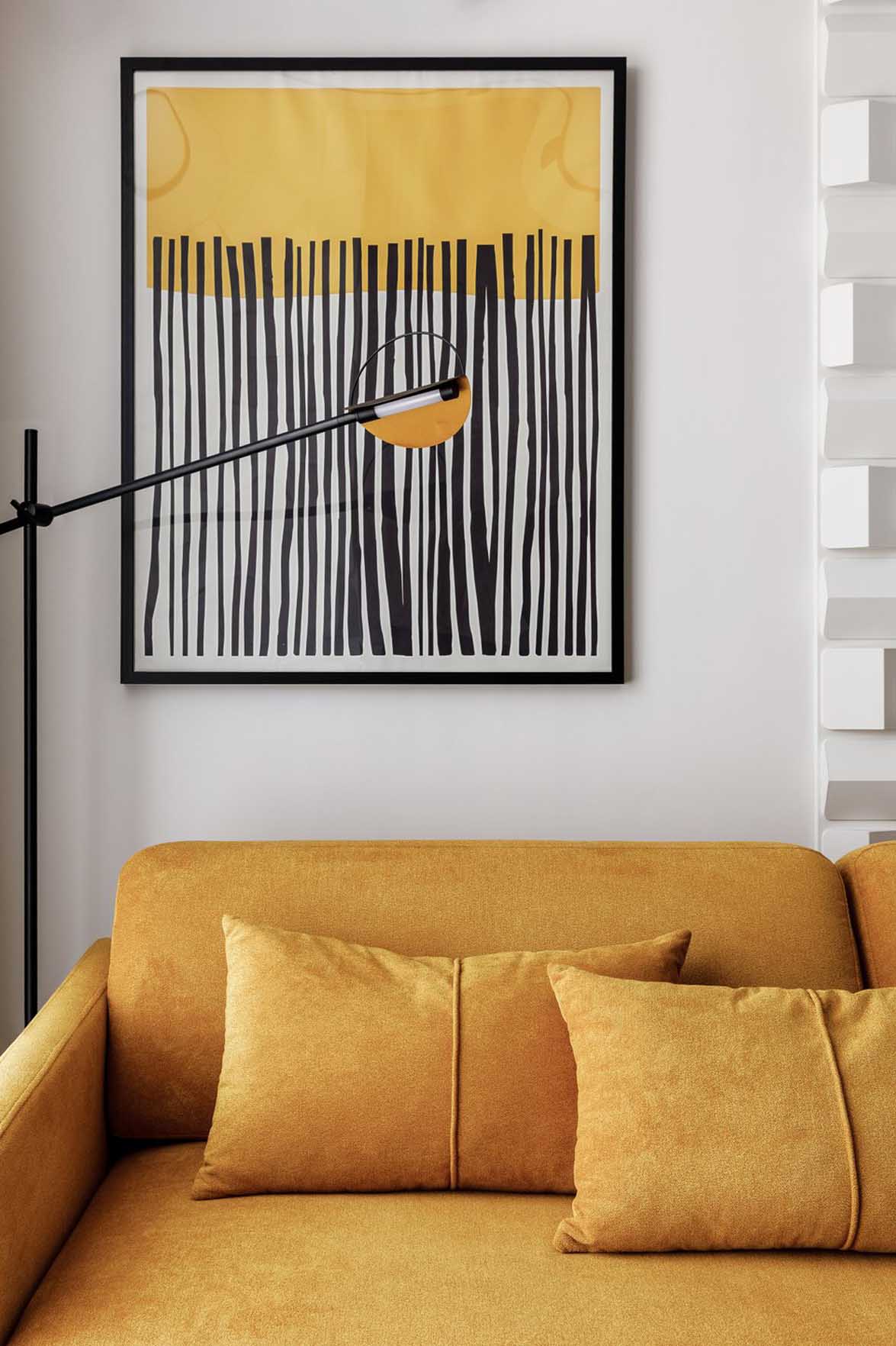 „A fiatalembernek fontos volt, hogy az otthona ne csak ergonomikus, hanem érzelmileg is inspiráló legyen” – emeli ki a lakberendező. A koncepció alapját a világos falak adják, amelyeket a klasszikus 70/20/10-es színarány szerint sárga és fekete elemekkel egészítettek ki. A fekete szín visszafogottan, ritmusadó elemként jelenik meg az ajtótokokon, a lámpatesteken, a bútorok lábain és a dekorációs printeken.