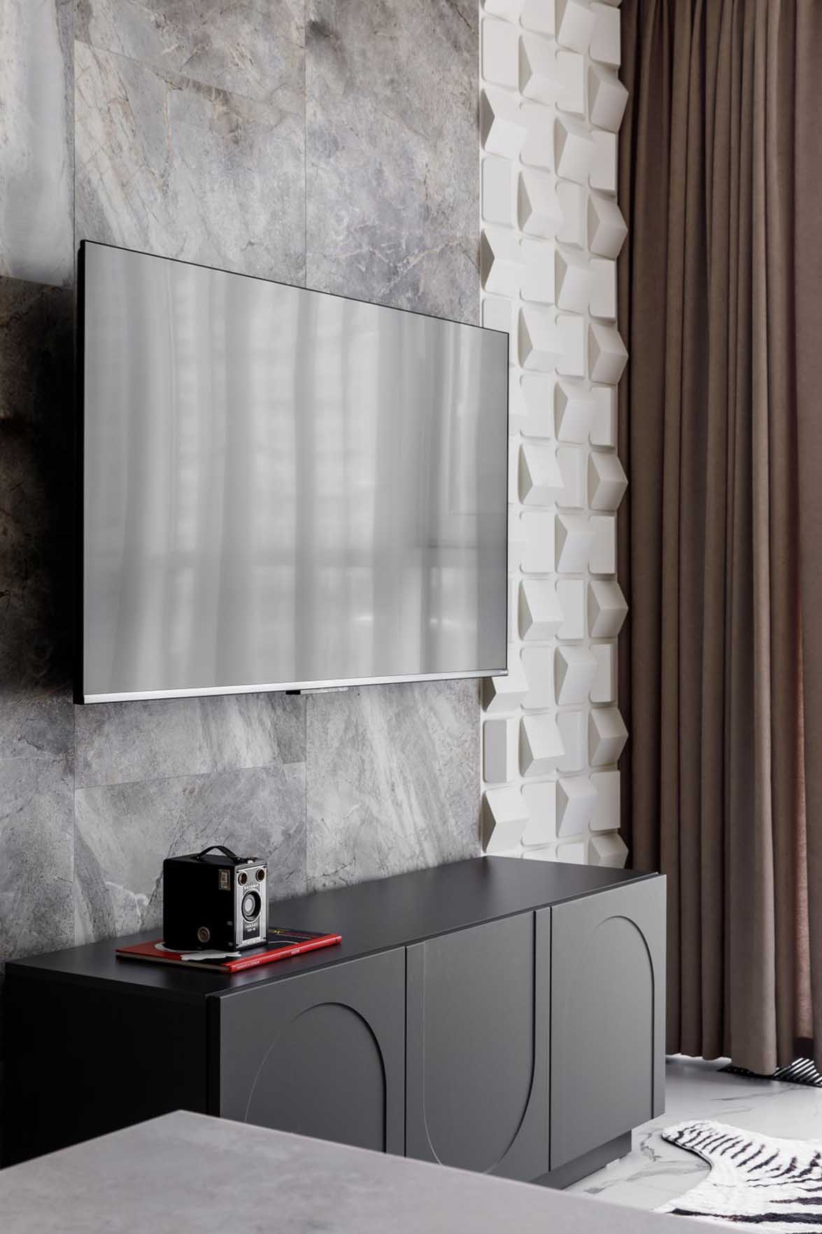 A pihenőzóna falait látványos 3D panelek díszítik, a TV-falat pedig falpanelek és gresslap burkolat kombinációjából álló kompozíció teszi egyedivé. Az enteriőr karakterét a geometriai játék adja: a poszteren megjelenő sávok, a karcsú állólámpa és a szőnyeg vonalai egyfajta vizuális ritmust teremtenek. A világítást modern, íves elemekkel kombinált sínrendszer biztosítja, amely a falról a mennyezetre fut fel.