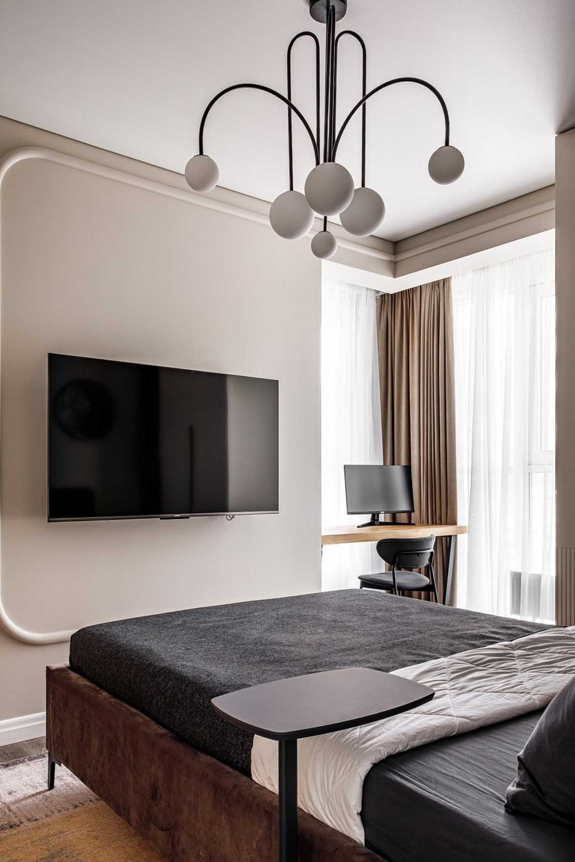 A hálószobában a falak mélyebb, selymes szürke árnyalatot kaptak. A padlóburkolat itt melegebb hatású vinylre vált, kivéve az ablak alatti sávot, ahol folytatódik a hidegburkolat. A helyiségben található szerkezeti áthidalót, amit nem lehetett eltávolítani, a tervező dizájnelemmé formálta: a félköríves stukkók az egyik falról ezen keresztül futnak át a szemközti oldalra. Az íves formavilágot a különleges, holdat formázó fali lámpa és a csillár is hangsúlyozza.