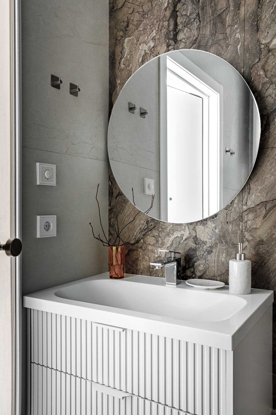 A fürdőszobában zuhanykabin, falra szerelt WC és mosdószekrény kapott helyet. A falakat és a padlót egységes gresslap burkolja, a hangsúlyos falrészeknél pedig márványhatású dekoráció emeli ki a mosdó környékét.