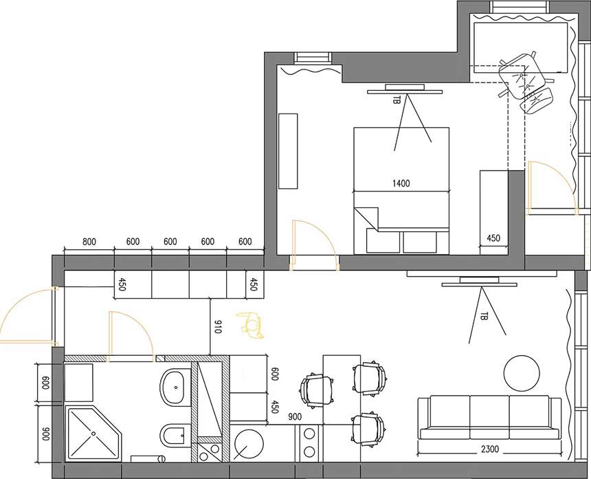 Az ingatlan eredetileg egy válaszfalak nélküli üres beton kocka volt, egyetlen monolit tartófallal a háló és a nappali között, amelyen nem lehetett változtatni. A tervező megtartotta az eredeti elrendezést, csupán a fürdőszoba ajtaját mozdította el 20 centiméterrel, hogy az egyik oldalon a mosdónak, a másikon pedig a mosógépnek alakíthasson ki ideális helyet. A vizesblokkok az eredeti pozíciójukban maradtak.