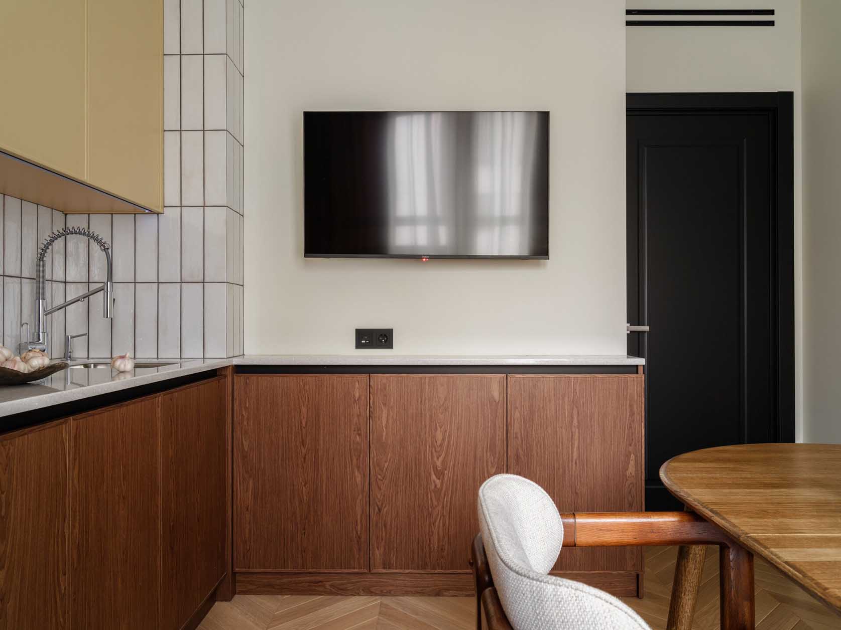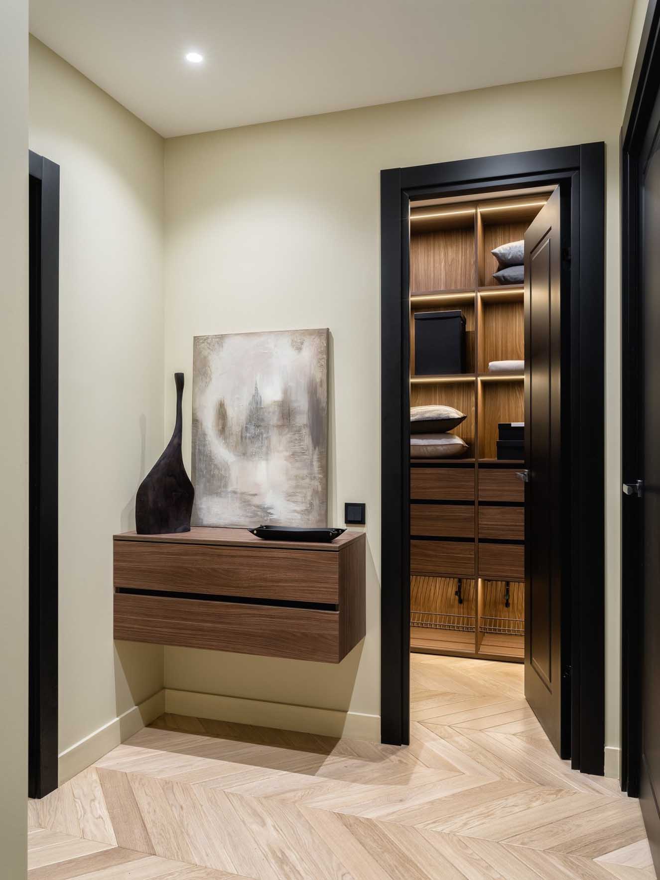 A tökéletes helykihasználás érdekében lakás teljes bútorzata egyedi méretre készült. A tárolóhelyek belső rendszerezését a megrendelő személyes igényeihez igazították. Ez a megközelítés lehetővé tette egy olyan kényelmes és harmonikus környezet kialakítását, ahol mindennek megvan a maga funkciója és minden könnyen hozzáférhető.