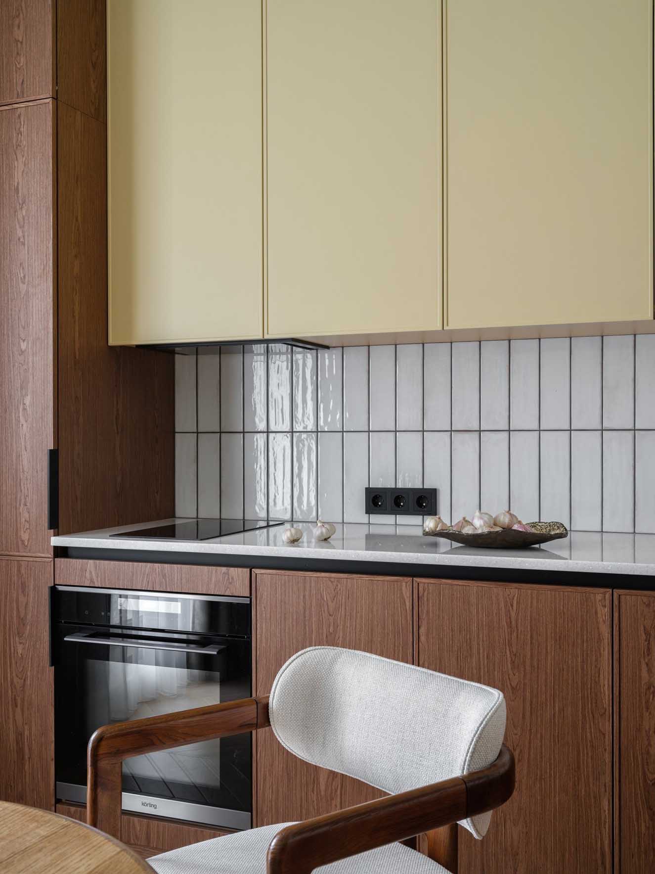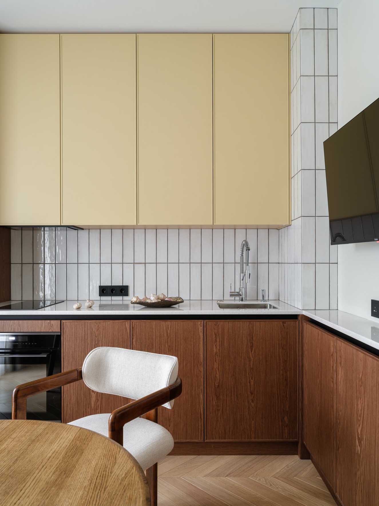 A konyhát két árnyalat finom kontrasztja jellemzi: a felső, tompított sárga frontok világos, légies atmoszférát teremtenek, míg a sötét fa erezetű alsó elemek mélységet és otthonosságot adnak a térnek. A konyha minden szükséges beépített géppel fel van szerelve, beleértve a hűtőszekrényt, a mosogatógépet, a főzőlapot, a sütőt és az integrált páraelszívót. Praktikus, modern kiegészítőként konyhamalac és vízszűrő rendszer is beépítésre került.