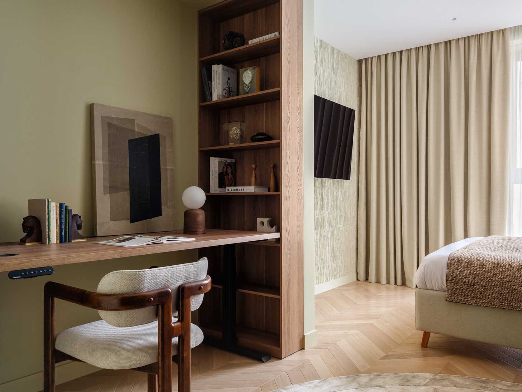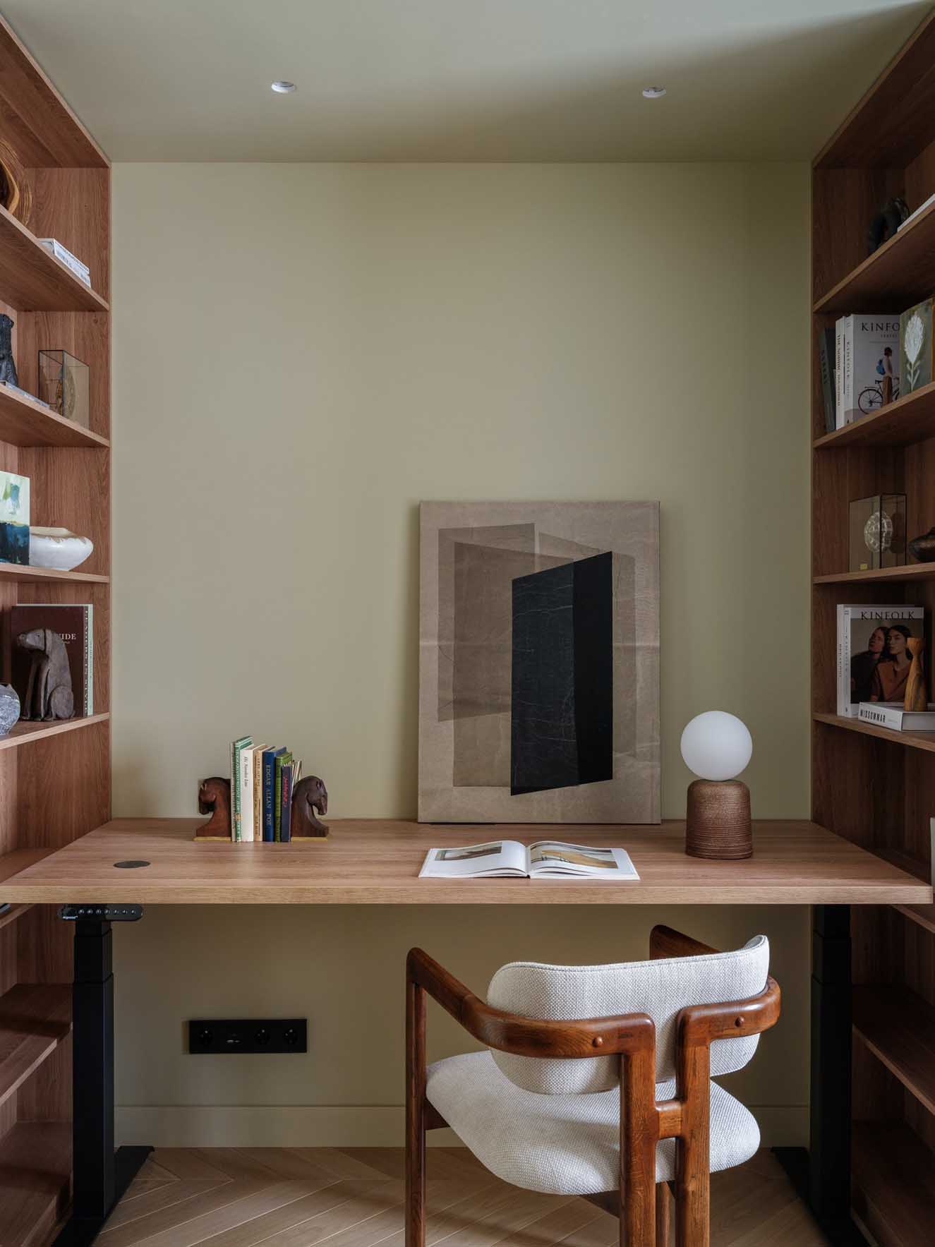 A munkaterület fókuszában egy nagyméretű, kényelmes íróasztal áll, amelynek két oldalán mennyezetig érő polcrendszereket terveztek. Ezek bőséges helyet kínálnak a szakkönyvek és dokumentumok tárolására. A szemközti falon egy kényelmes, kinyitható kanapé kapott helyet.