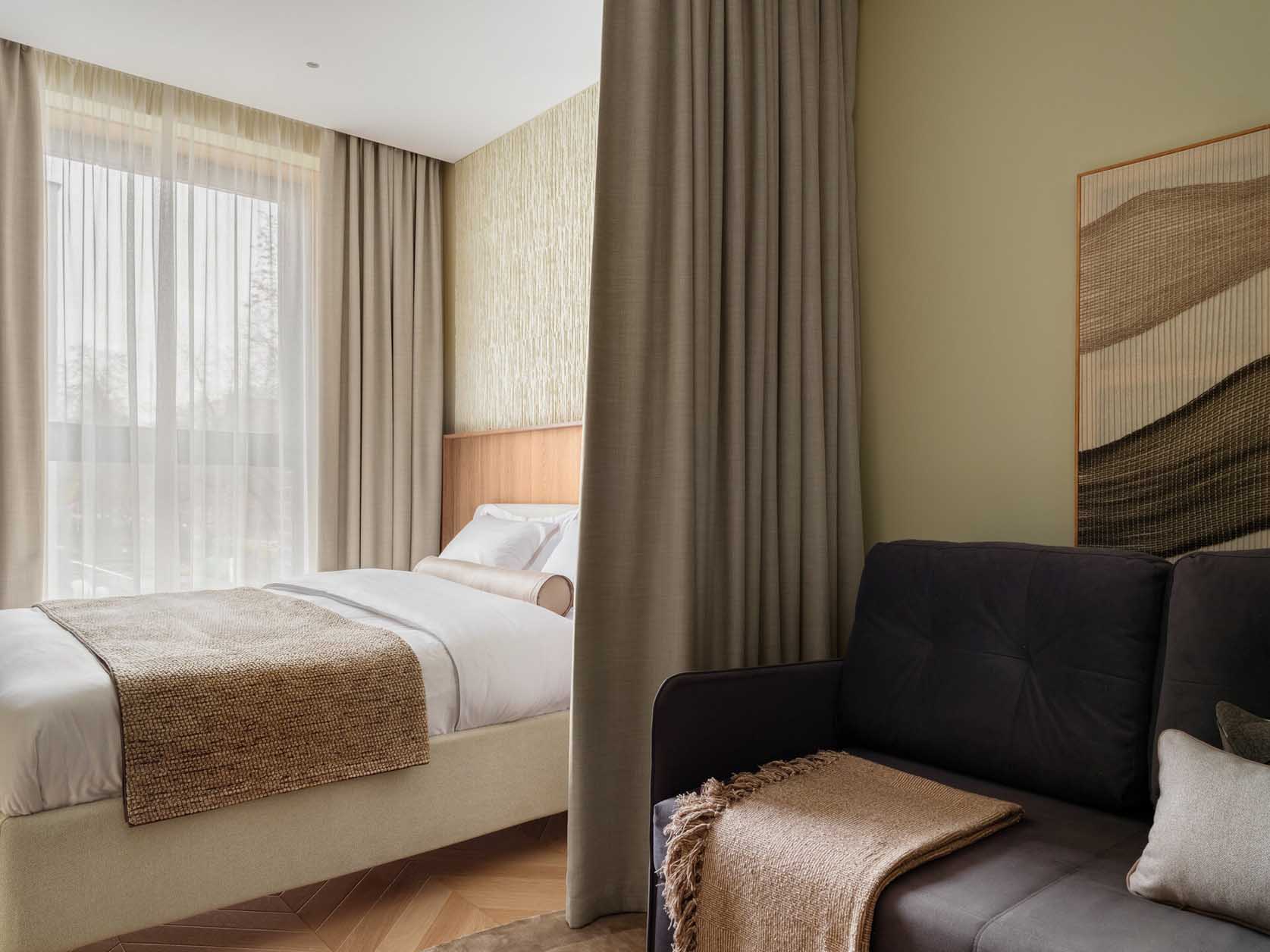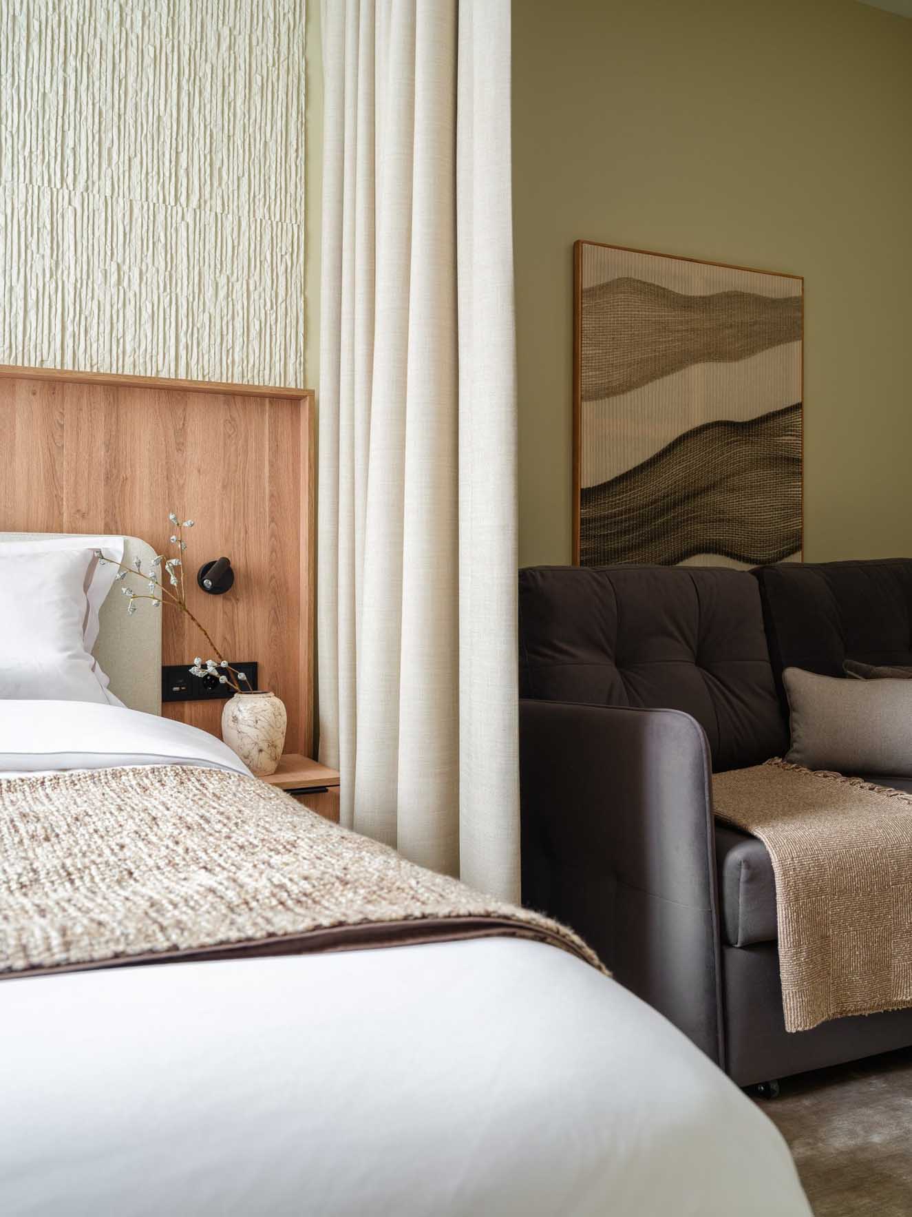 A fő helyiség ablakhoz közeli részén alakították ki a hálózónát egy nagyméretű franciaággyal. A sötét furnérból készült fejtámlát azonos anyagú éjjeliszekrények egészítik ki. A hálót egy esztétikus textilfüggöny választja el a munkaterülettől, amely szükség esetén intimitást biztosít és meghitt hangulatot teremt.