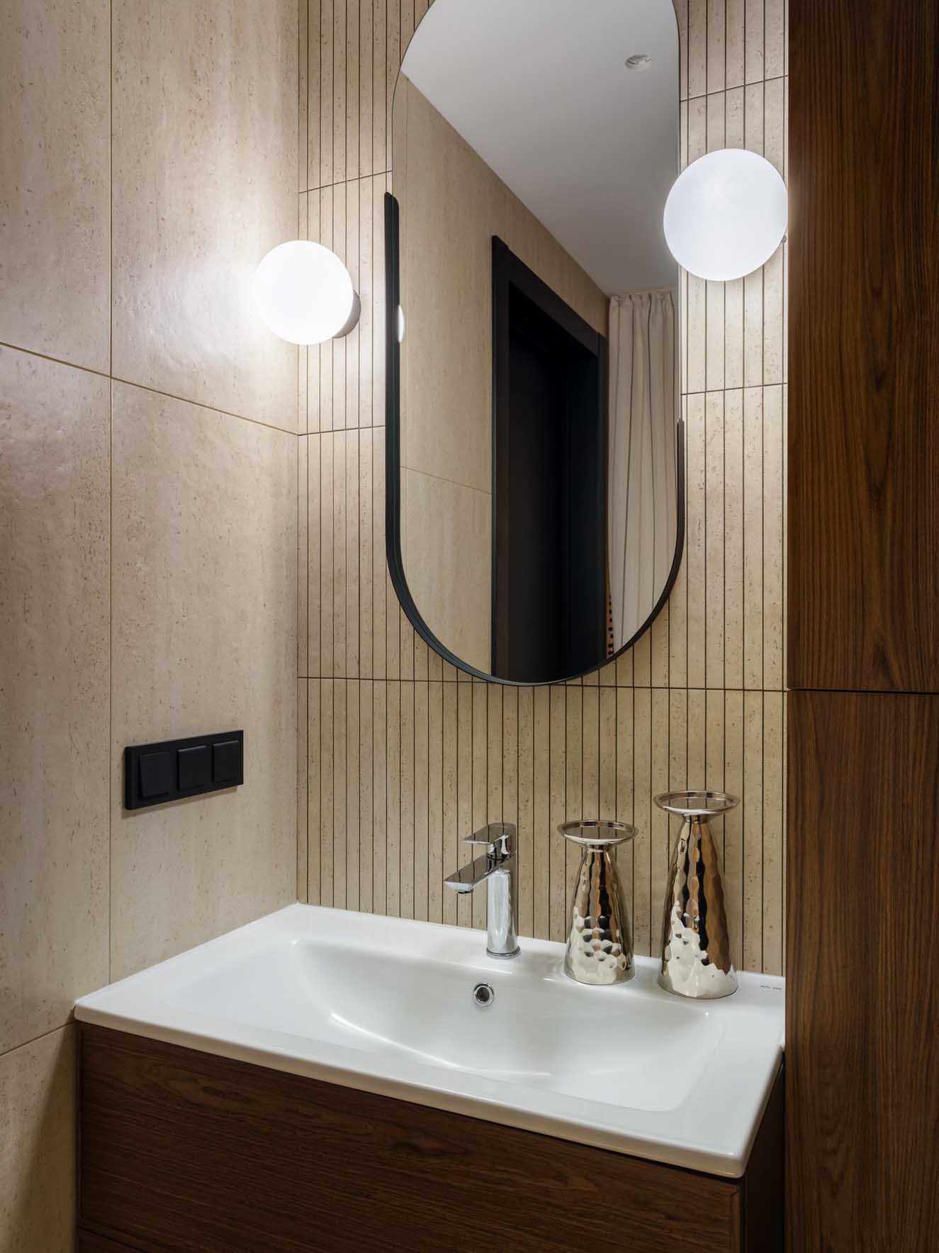 A fürdőszoba burkolásához különböző méretű és formátumú csempéket használtak, ami vizuális dinamikát visz az enteriőrbe. A tárolás itt is kiemelt szerepet kapott: egy mennyezetig érő, sötét frontos szekrény, egy beépített, nyitott polcos elem, egy mosdó alatti pultos szekrény, valamint a kád zónájában kialakított, rejtett világítással ellátott falfülkék gondoskodnak a kozmetikumok és törölközők elhelyezéséről. Ezek a megoldások rendkívül funkcionálissá teszik a teret, miközben hangsúlyozzák a modern és letisztult dizájnt.