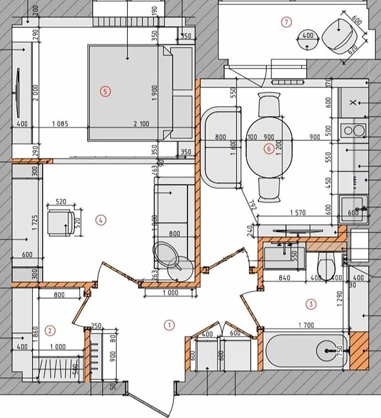 Az eredeti alaprajzot teljes egészében megtartották. A lakás egy különálló konyhát és egy fő helyiséget foglal magában, utóbbit okos zónázással alvó- és nappali + munkaterületre osztották. Az előszobában, az eredeti terveknek megfelelően egy gardróbot alakítottak ki. Itt kapott helyet a háztartási blokk is, amely egy mosó- és egy szárítógépet rejt. A fürdőszoba és a toalett egy helyiségben található, ide a megrendelő kérésére egy teljes méretű fürdőkád került beépítésre.