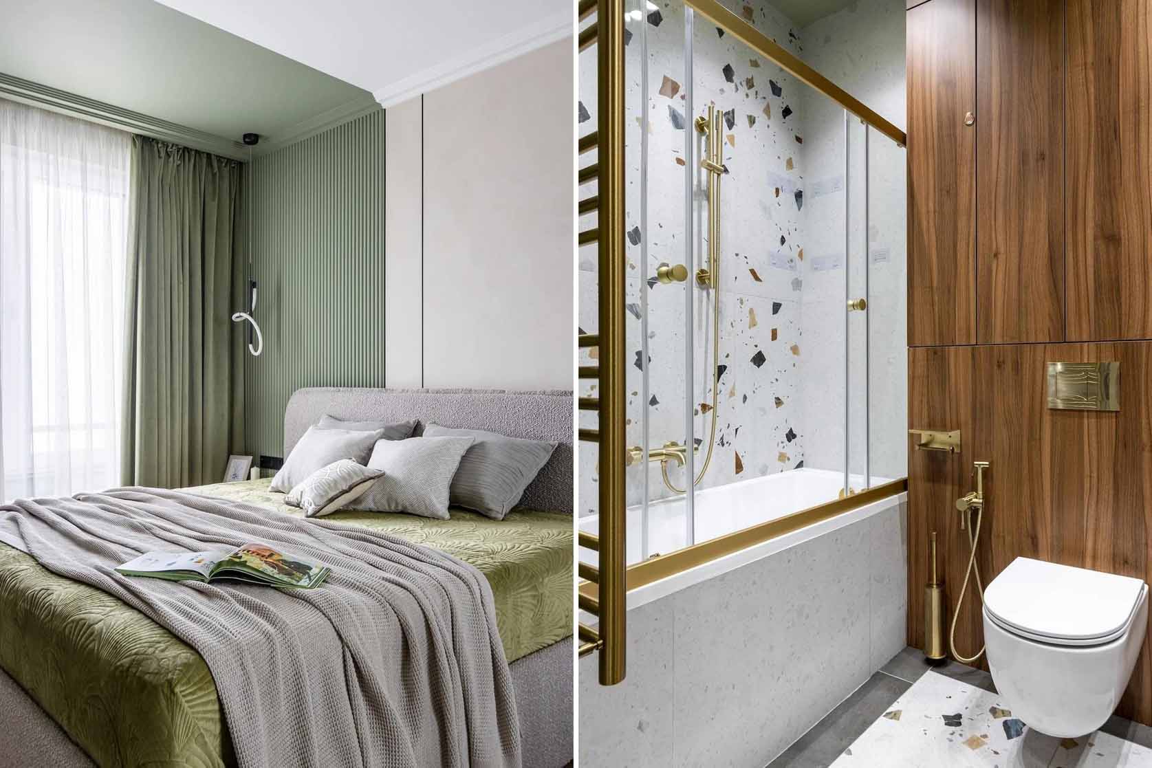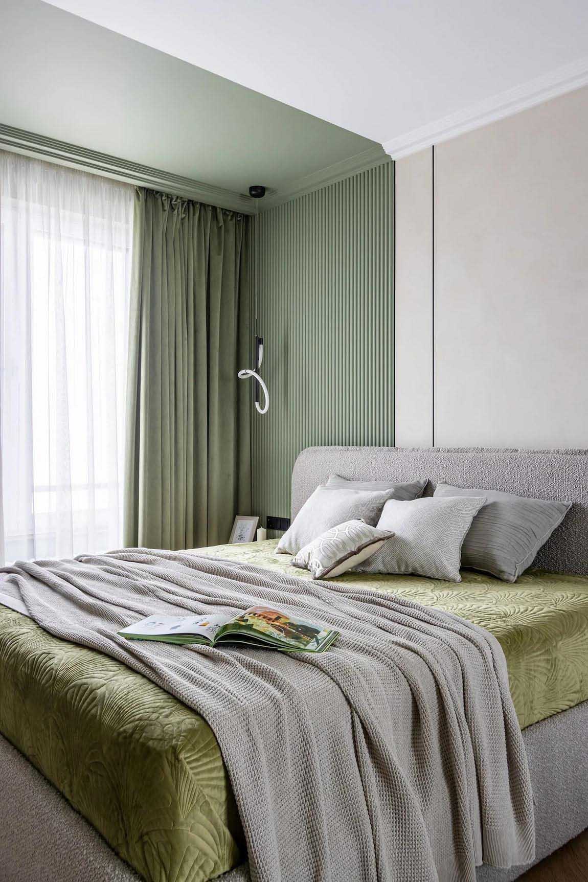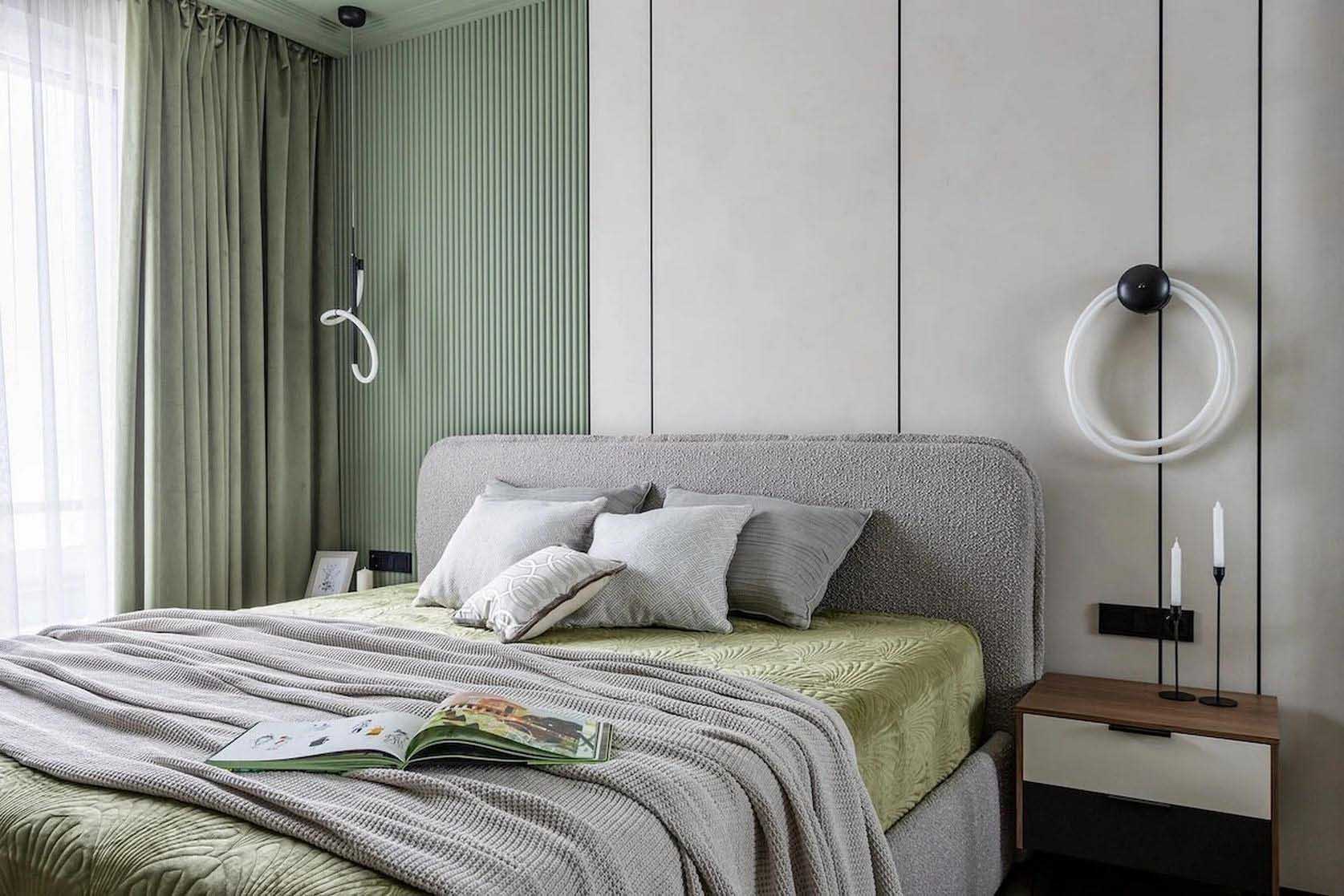 A hálószoba bejáratánál egy nyitott és zárt polcokat ötvöző állvány szolgál a könyvek és a dekorációs tárgyak tárolására. A szoba fókuszpontjában a franciaágy áll, vele szemben pedig egy komód és egy falra szerelt lebegő konzol kapott helyet, amely szükség esetén teljes értékű dolgozóasztalként is funkcionál. A ruhák tárolását egy beépített, tükrös ajtókkal ellátott gardróbszekrény oldja meg, amely optikailag jelentősen tágítja a teret. A falakat térhatású 3D panelek és az ablak körüli, hangsúlyos pisztácia színű festés teszi izgalmassá. A világítást itt is sínrendszer biztosítja, amelyet az ágy melletti – a nappali lámpájával megegyező kollekcióból származó – aszimmetrikus elrendezésű függőlámpa és falikar egészít ki.