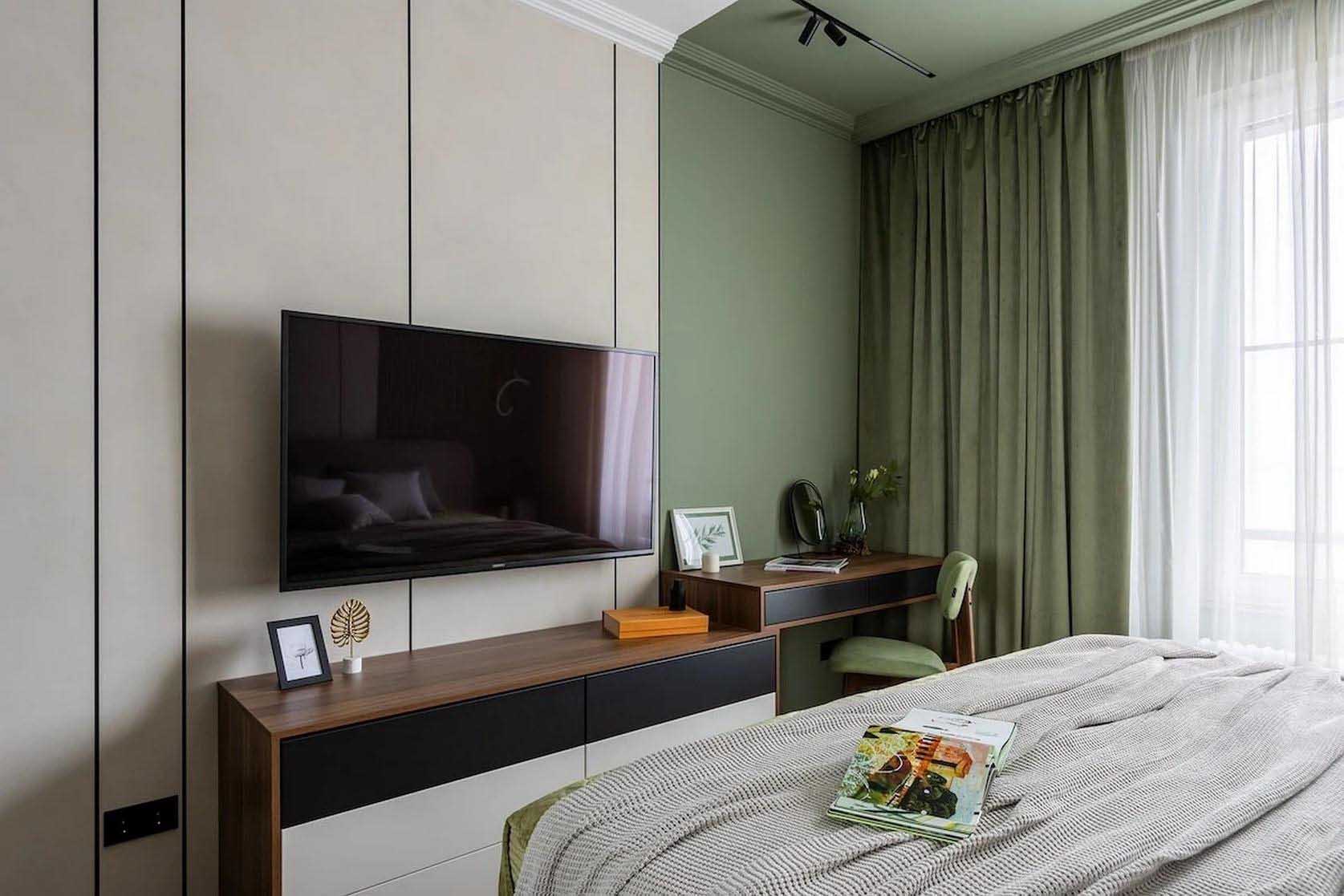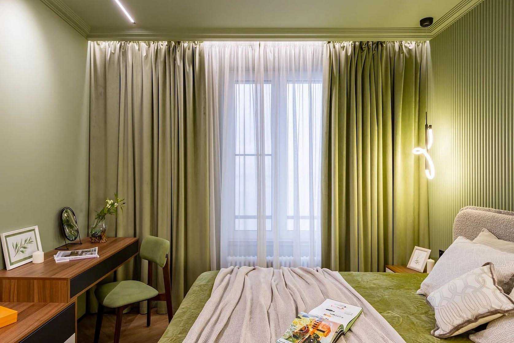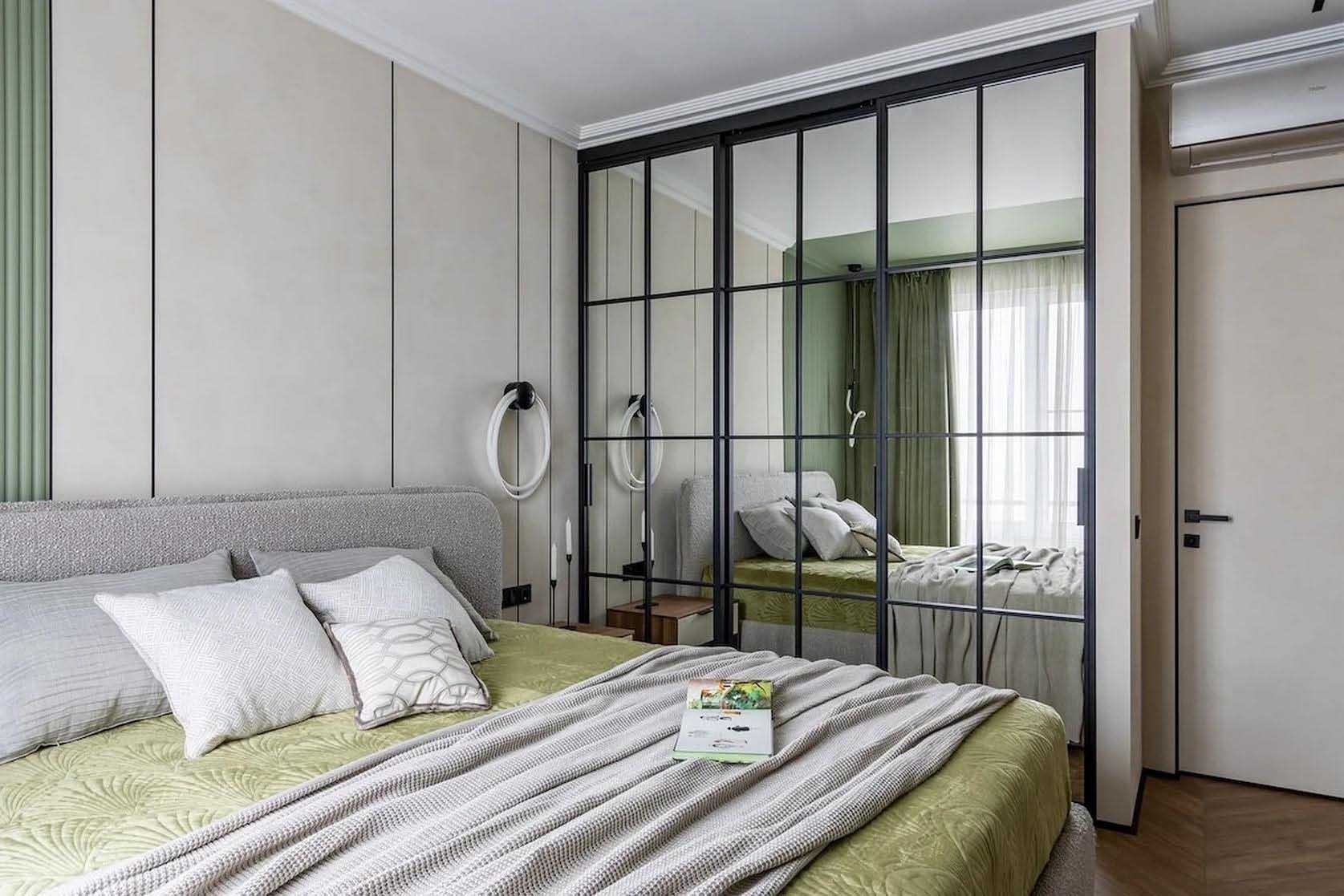 A hálószoba bejáratánál egy nyitott és zárt polcokat ötvöző állvány szolgál a könyvek és a dekorációs tárgyak tárolására. A szoba fókuszpontjában a franciaágy áll, vele szemben pedig egy komód és egy falra szerelt lebegő konzol kapott helyet, amely szükség esetén teljes értékű dolgozóasztalként is funkcionál. A ruhák tárolását egy beépített, tükrös ajtókkal ellátott gardróbszekrény oldja meg, amely optikailag jelentősen tágítja a teret. A falakat térhatású 3D panelek és az ablak körüli, hangsúlyos pisztácia színű festés teszi izgalmassá. A világítást itt is sínrendszer biztosítja, amelyet az ágy melletti – a nappali lámpájával megegyező kollekcióból származó – aszimmetrikus elrendezésű függőlámpa és falikar egészít ki.