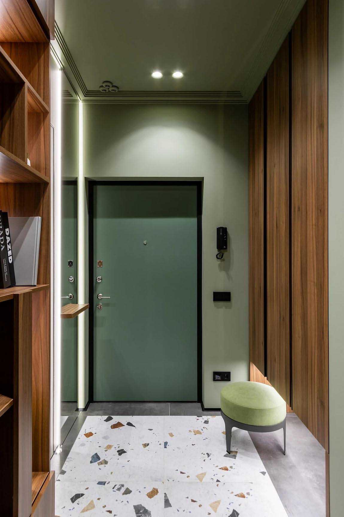 A lakásba lépve egy nagyméretű, sötét diófa színű beépített szekrény fogadja az érkezőket, amely rengeteg helyet kínál a ruháknak és egyéb holmiknak. A szekrény alsó részén nyitott tárolót alakítottak ki a cipőknek, illetve itt kapott helyet a robotporszívó is, a hozzá gondosan előkészített rejtett töltőaljzattal. A padlót nagyméretű, elegáns, terrazzo mintás greslapok borítják. A falakon világos árnyalatú, texturált dekorvakolat látható, míg a mennyezetet pisztácia színűre festették, amelybe minimalista, gipszbe süllyesztett spotlámpákat integráltak a letisztult megjelenés érdekében.