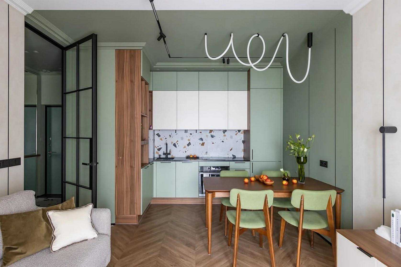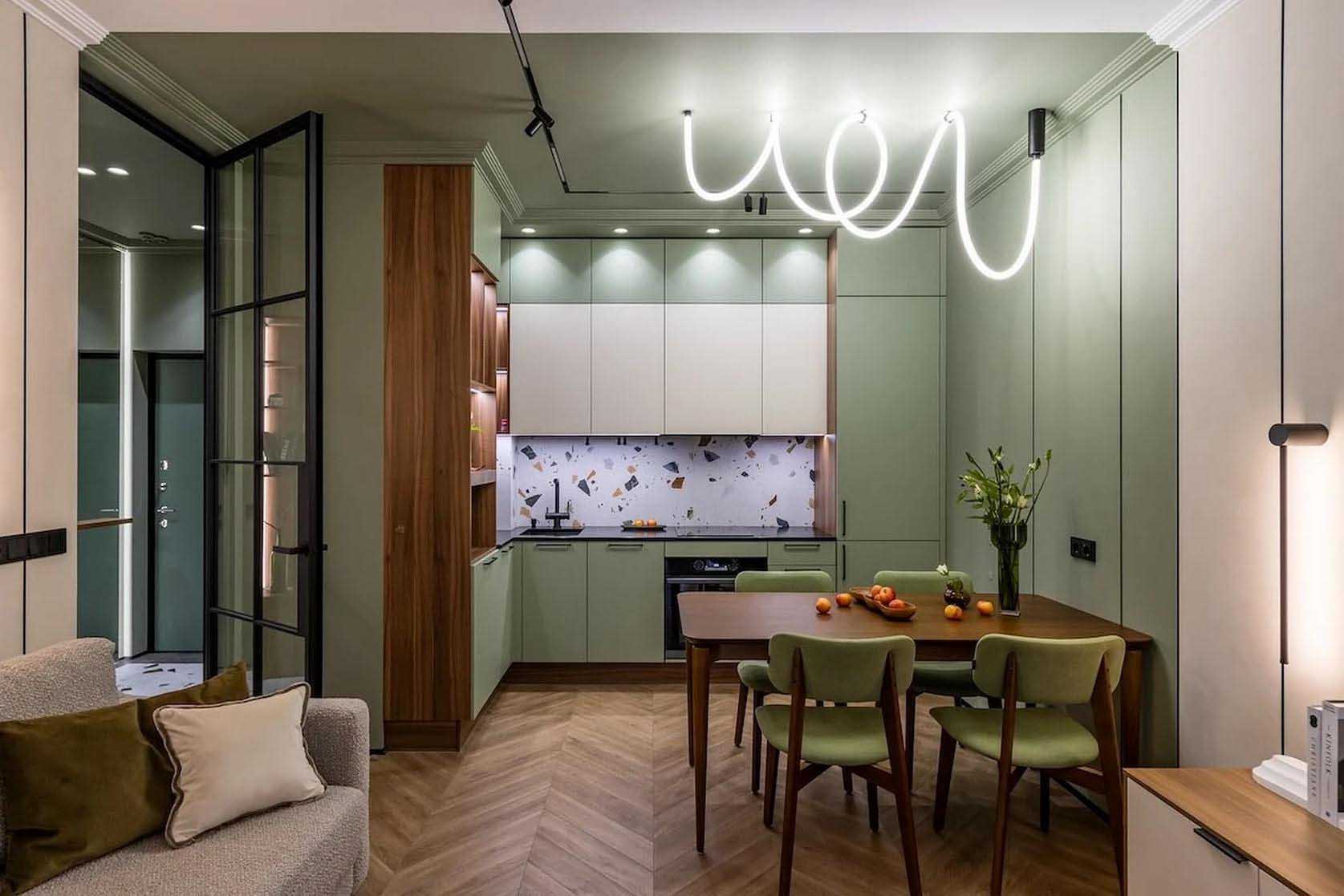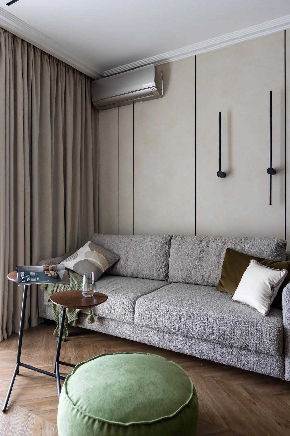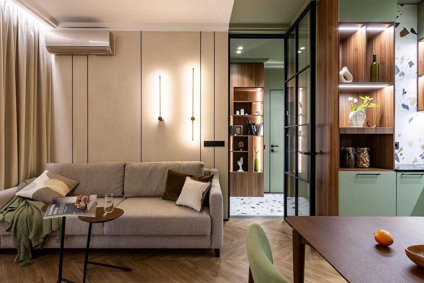 A tervező feladata egy olyan funkcionális tér létrehozása volt, amely magában foglal egy konyha-nappalit kényelmes, alvásra alkalmas kanapéval és étkezővel, beépített gépesített konyhát, valamint hálószobát tágas tárolókkal és dolgozósarokkal. A belsőépítészeti koncepció alapjául egy semleges, világos bézs bázist választottak, hogy ne terheljék túl a teret, amelyet a megrendelő kedvenc színe, a pisztácia egészít ki – ehhez meleg, sötét diófa felületeket és finom, fekete fém kiegészítőket társítottak.