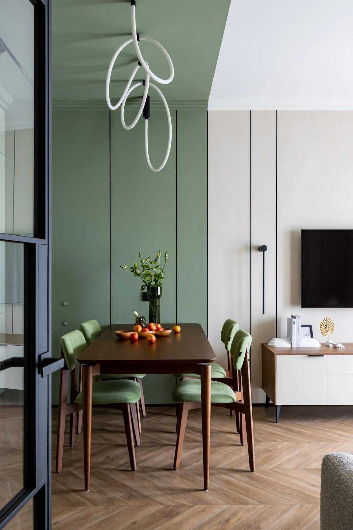 A közösségi térben a padlót parkettát imitáló, halszálka mintás vinyl burkolat fedi, amely elegáns és tartós alapot ad a zónáknak. A sarok elrendezésű konyha felső szekrényei egészen a mennyezetig érnek, maximalizálva a tárolókapacitást. Az alsó frontok és a legfelső szekrénysor a falak, illetve a részben ide is beforduló pisztácia színű mennyezet árnyalataihoz igazodnak, harmonikus, beépített hatást keltve. A konyhapult feletti megfelelő munkafényről süllyesztett világítás gondoskodik.