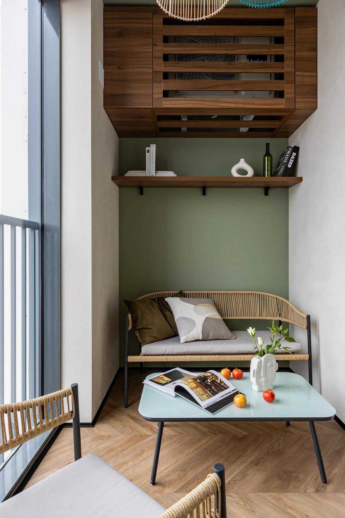 A hálószobához kapcsolódó lodzsán – ahol szintén folytatódik a halszálkás padlóburkolat – egy kis kanapéval és fotellel berendezett pihenősarkot hoztak létre. A klíma kültéri egységét egy asztalos által készített, szellőzőnyílásokkal ellátott, sötét diófa panelekből álló dobozzal álcázták.