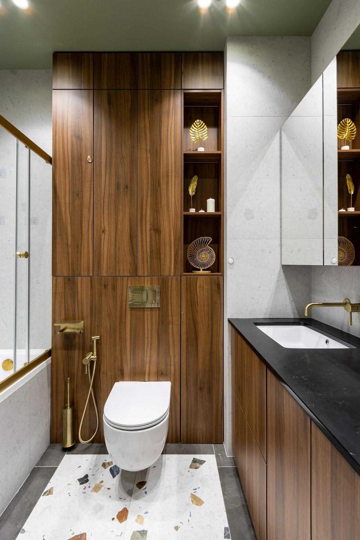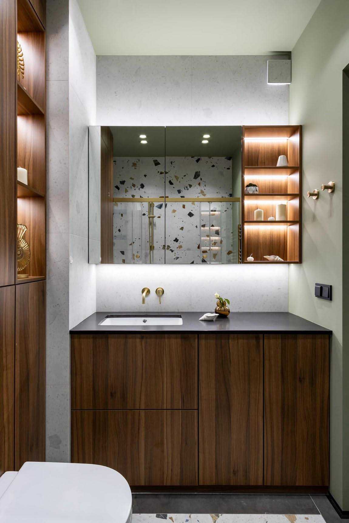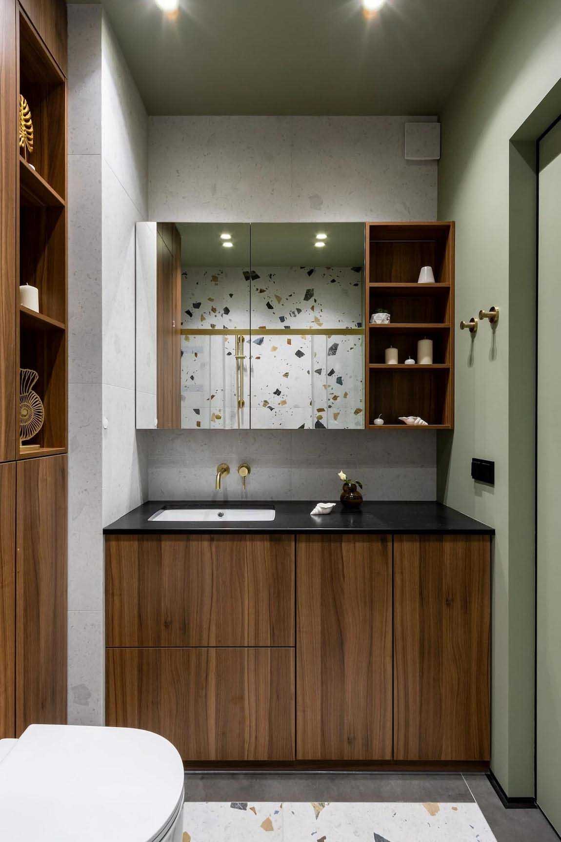 A fürdőszobában az előszobából már ismert terrazzo greslapok köszönnek vissza a padlón és az egyik kiemelt falon, melyeket világos semleges csempével és pisztácia színű festéssel kombináltak a tervezők. Egy tágas mosdószekrény esztétikusan rejti el a mosógépet. A mosdó felett tükrös homlokzatú, apróságokat elnyelő függesztett szekrények találhatók. A beépített WC tartálya feletti gépészeti elemeket az előszobai bútorokkal és a lodzsa paneleivel megegyező, sötét diófa színű bútorlapokkal burkolták, mögöttük pedig további hasznos tárolópolcokat alakítottak ki. A helyiség hangulata a mosdószekrény és a tükör alatti, diszkrét rejtett LED világítással alakítható.