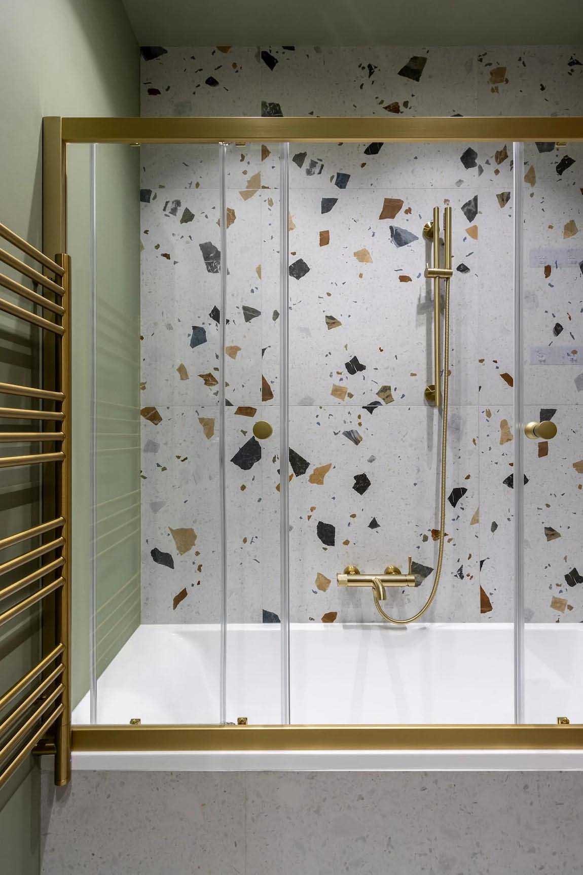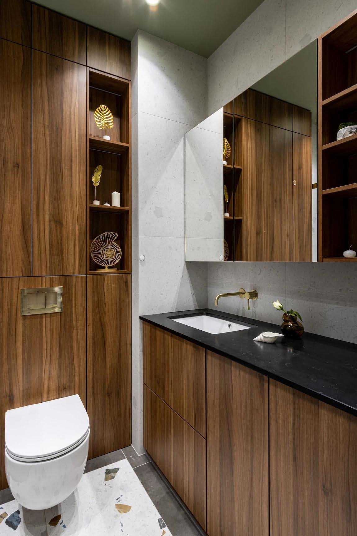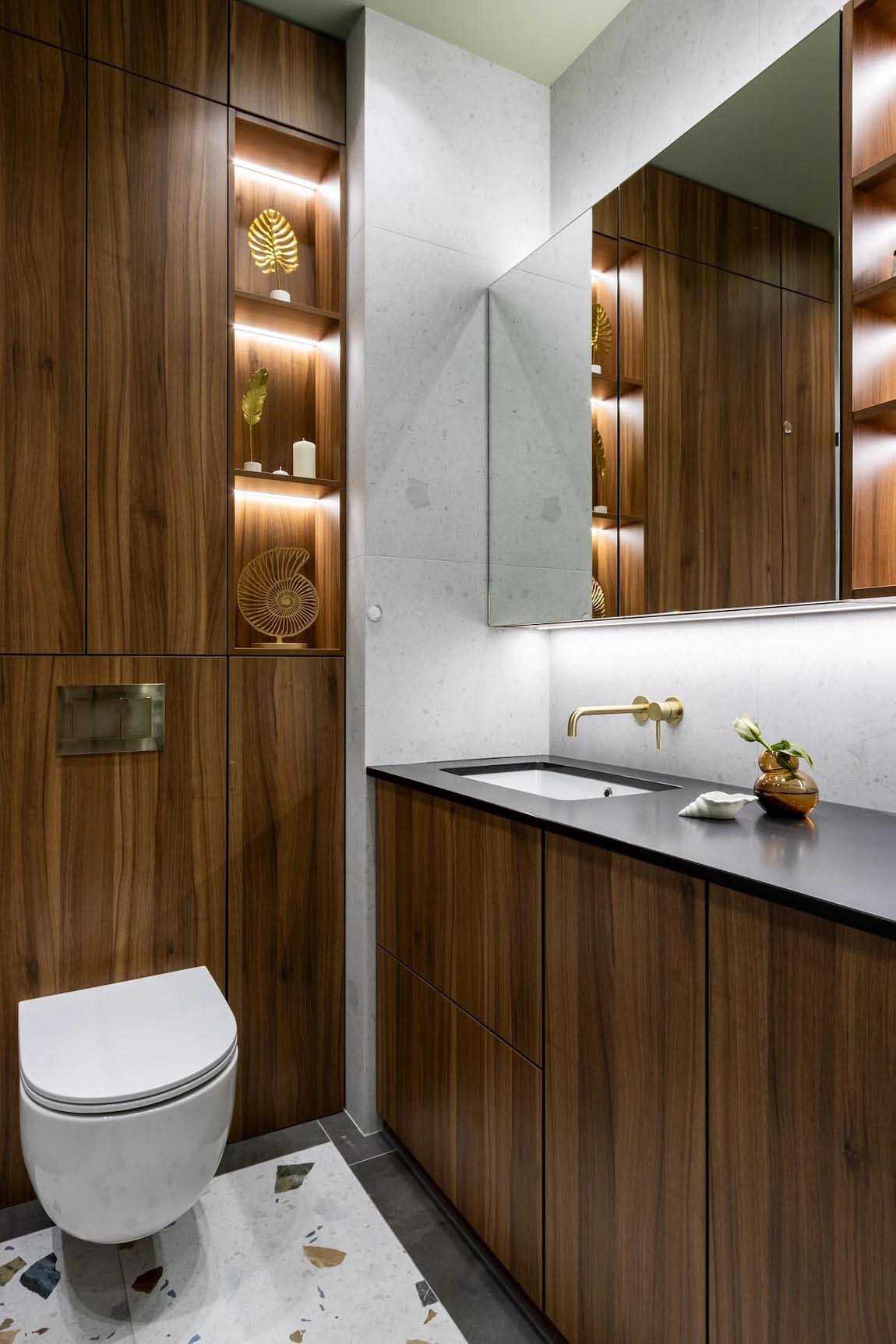 A fürdőszobában az előszobából már ismert terrazzo greslapok köszönnek vissza a padlón és az egyik kiemelt falon, melyeket világos semleges csempével és pisztácia színű festéssel kombináltak a tervezők. Egy tágas mosdószekrény esztétikusan rejti el a mosógépet. A mosdó felett tükrös homlokzatú, apróságokat elnyelő függesztett szekrények találhatók. A beépített WC tartálya feletti gépészeti elemeket az előszobai bútorokkal és a lodzsa paneleivel megegyező, sötét diófa színű bútorlapokkal burkolták, mögöttük pedig további hasznos tárolópolcokat alakítottak ki. A helyiség hangulata a mosdószekrény és a tükör alatti, diszkrét rejtett LED világítással alakítható.