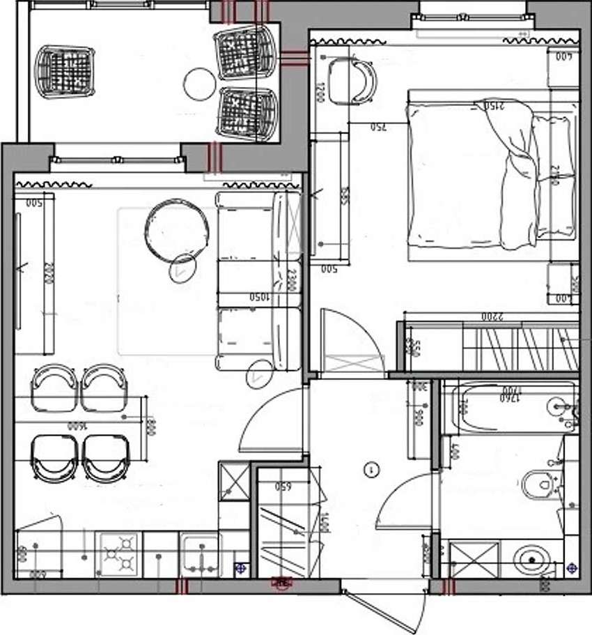 Az eredeti alaprajz egy viszonylag klasszikus elosztást követett: egy különálló hálószobát, egybenyitott konyha-nappalit, egy fürdőszobát és lodzsát tartalmazott. Mivel a terek elrendezése alapvetően megfelelt a család igényeinek, a tervező csak egyetlen stratégiai ponton nyúlt bele az alaprajzba. A hálószoba ajtaját kissé eltolták, hogy ezáltal az előszobában elegendő falfelület szabaduljon fel egy teljes értékű, beépített tárolórendszer számára.
