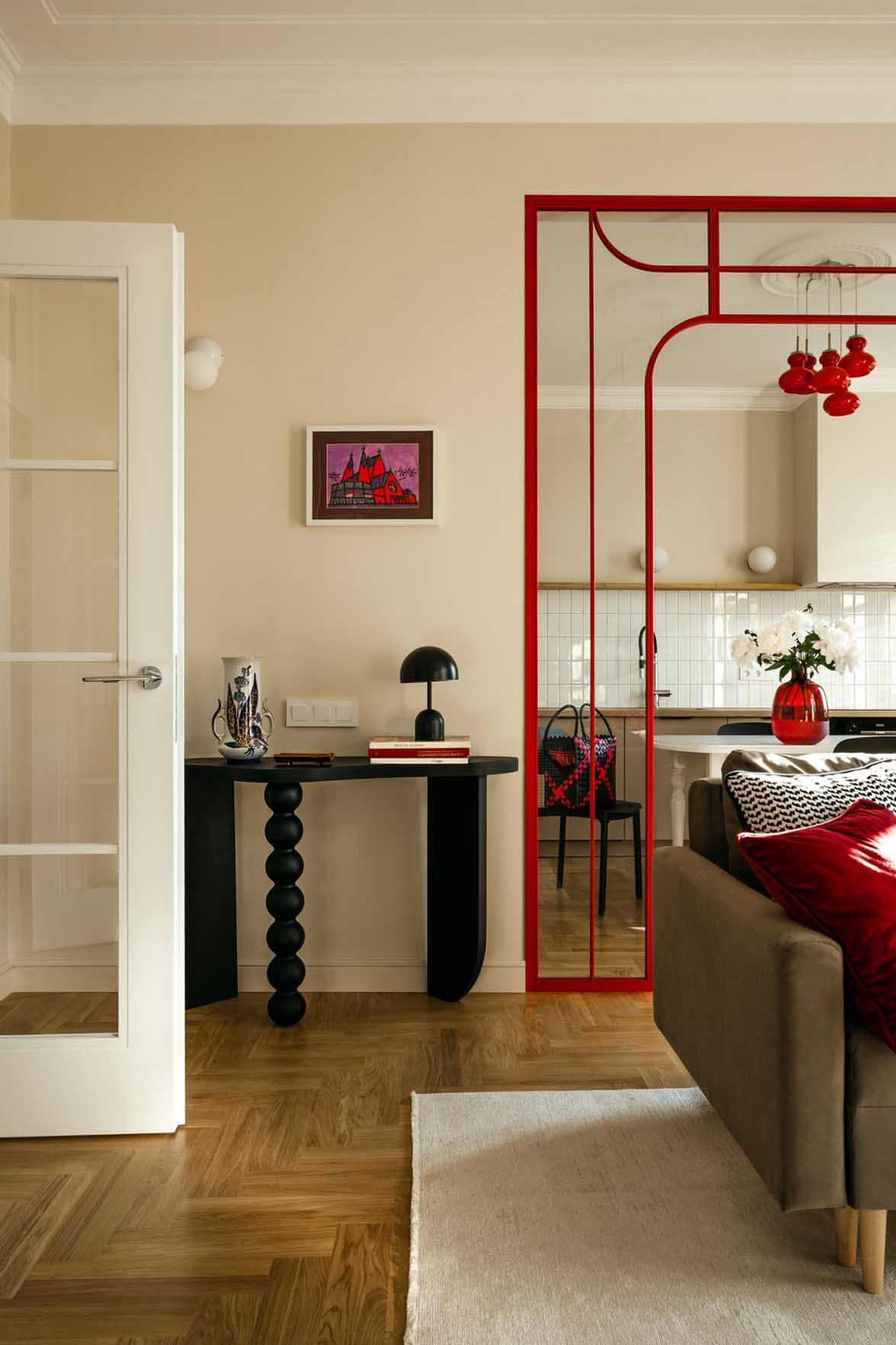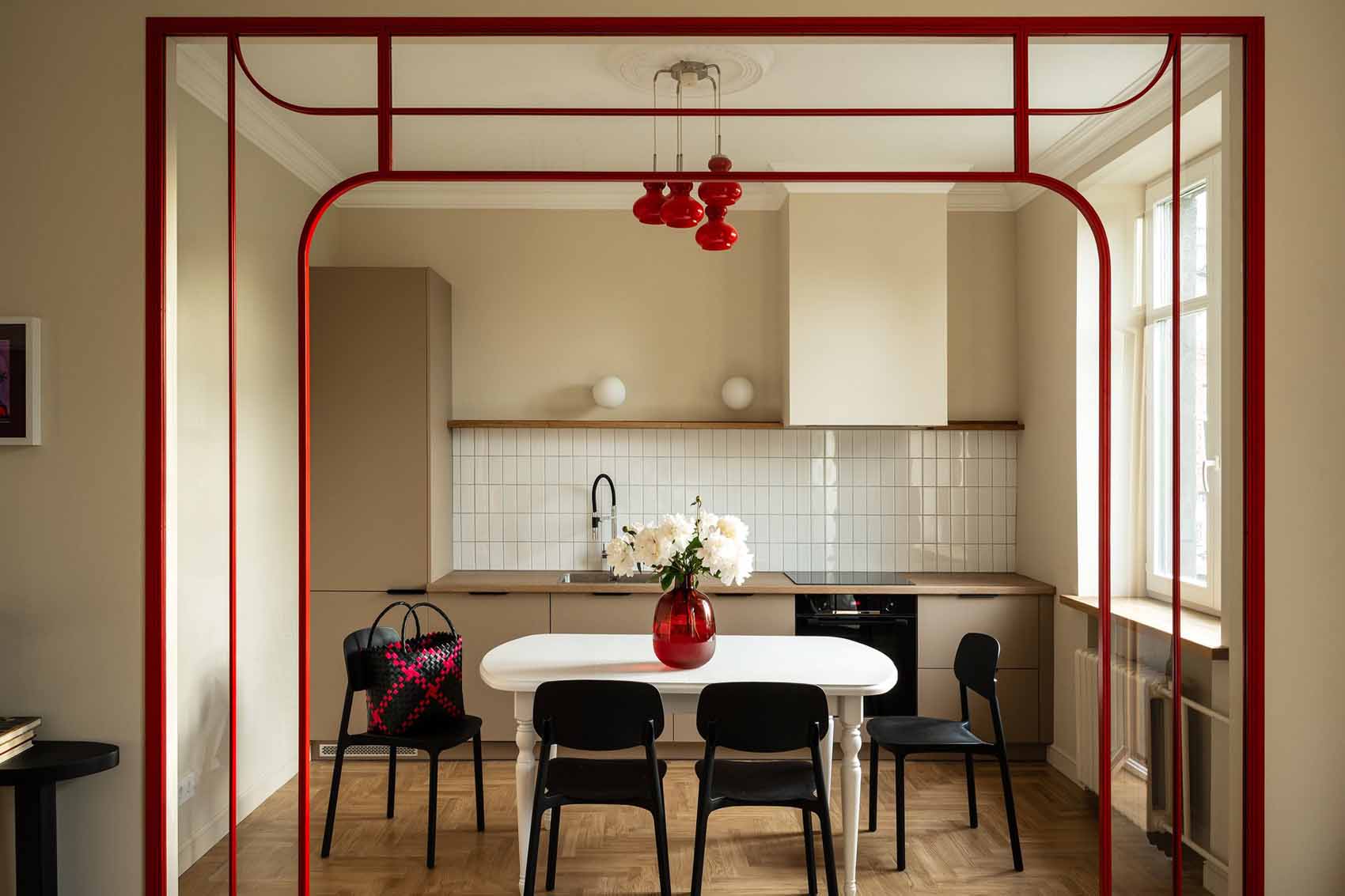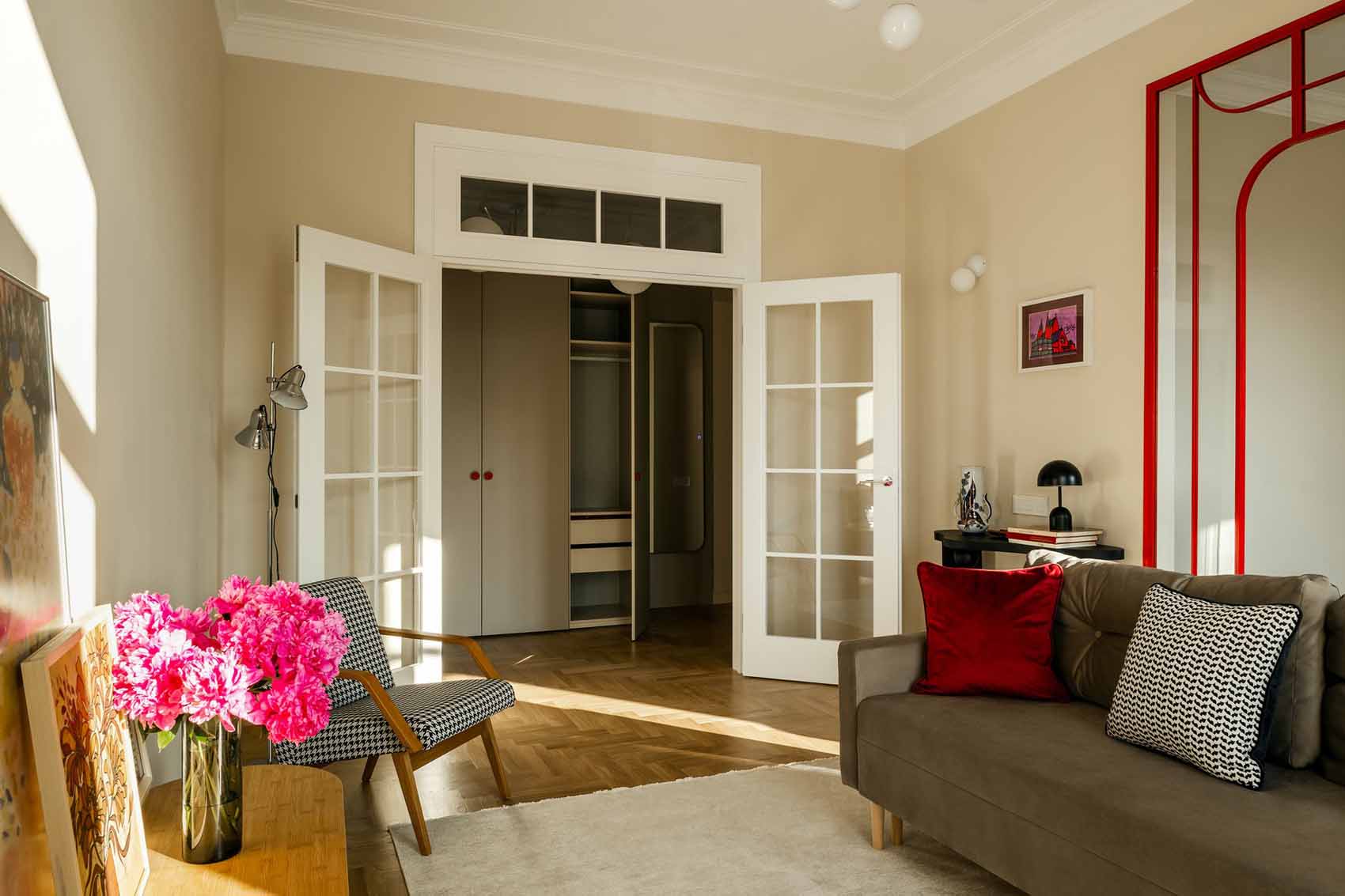 A burkolatok és falfelületek semlegesek maradtak, mintegy alapot adva a leendő tulajdonos elképzeléseinek. A felújított eredeti stukkók és a markáns részletek – mint a konyhába vezető piros boltív, vagy az étkezőasztal feletti piros, vintage csillár – azonban egyértelműen meghatározták a további dekoráció irányát.