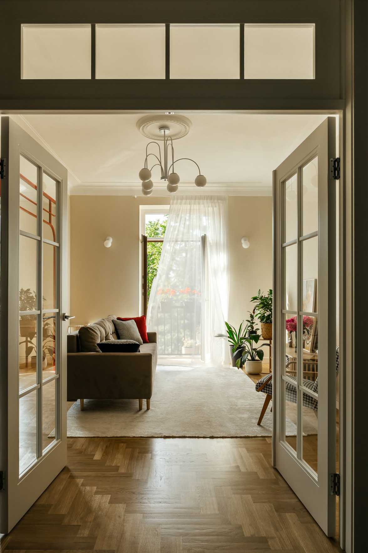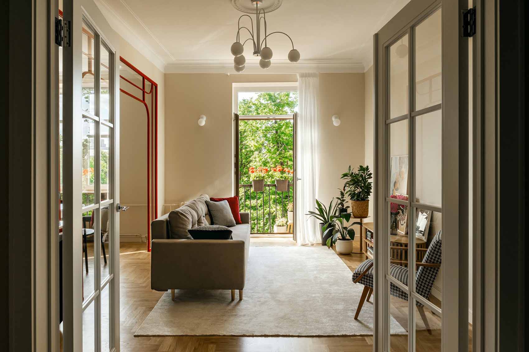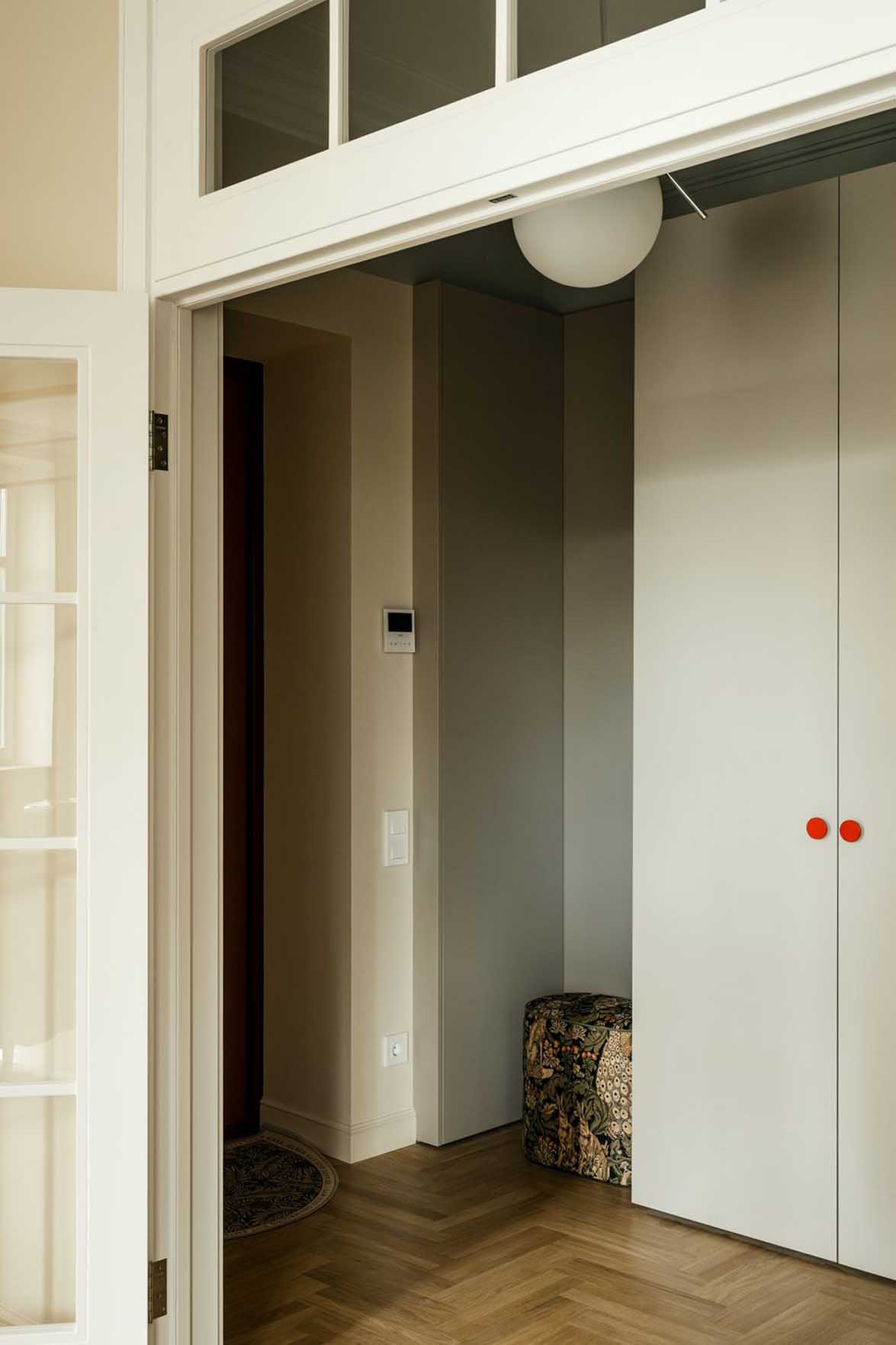 A burkolatok és falfelületek semlegesek maradtak, mintegy alapot adva a leendő tulajdonos elképzeléseinek. A felújított eredeti stukkók és a markáns részletek – mint a konyhába vezető piros boltív, vagy az étkezőasztal feletti piros, vintage csillár – azonban egyértelműen meghatározták a további dekoráció irányát.