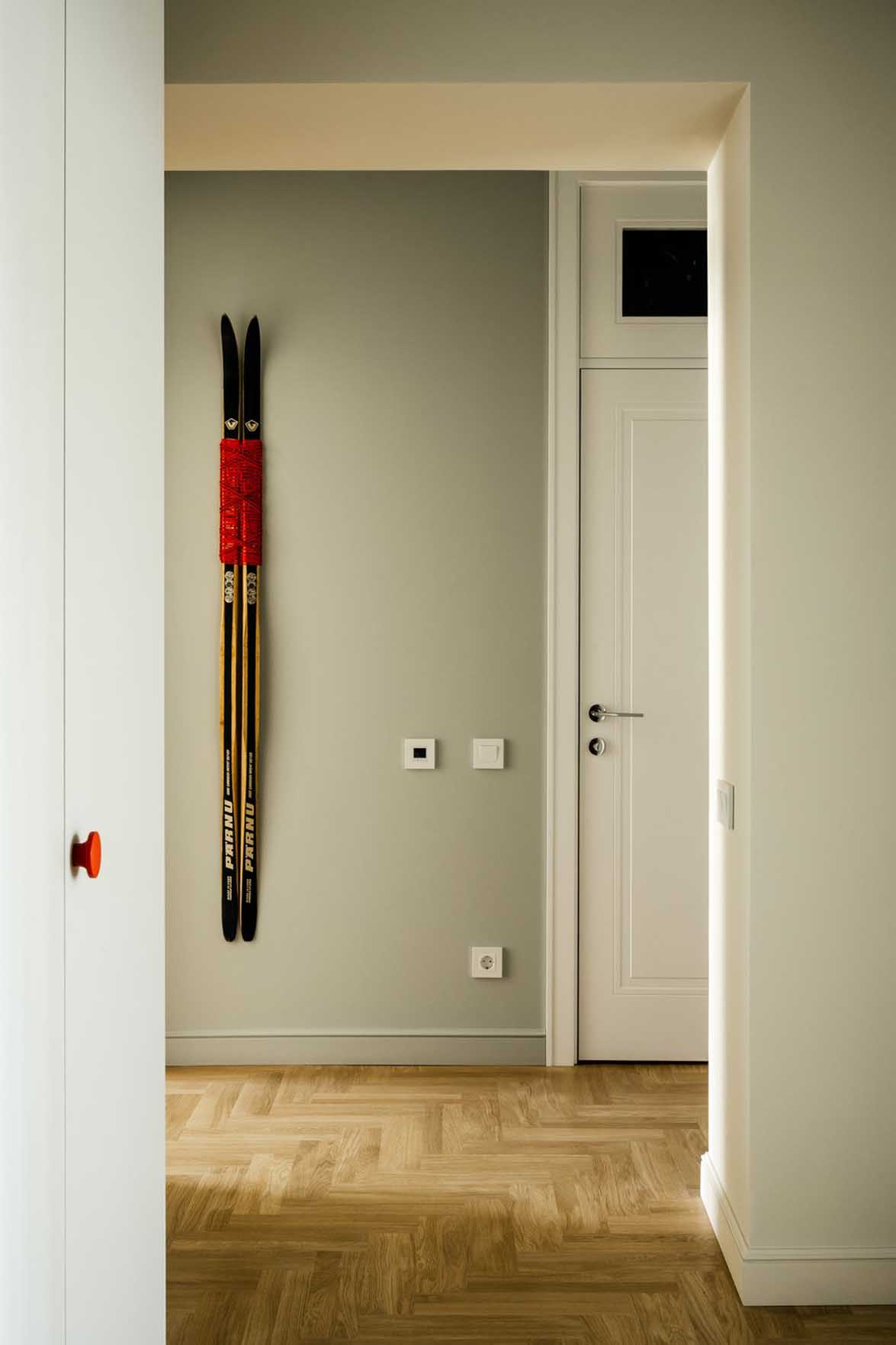 Az előszoba falát egy sílécekből álló egyedi dekoráció díszíti. A síléceket egy lomtárban találták, majd alapos tisztítás és restaurálás után textillel vonták be őket.