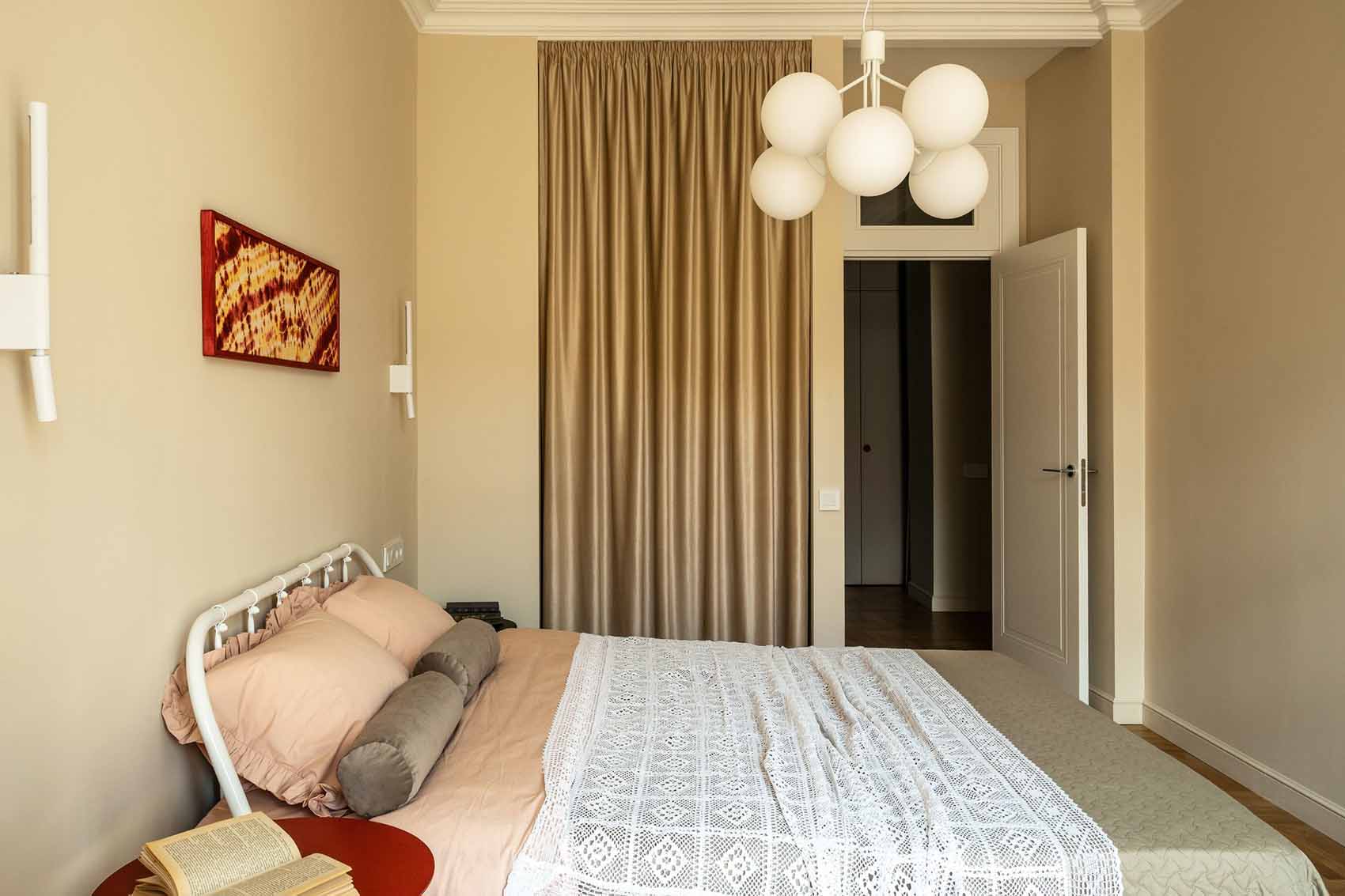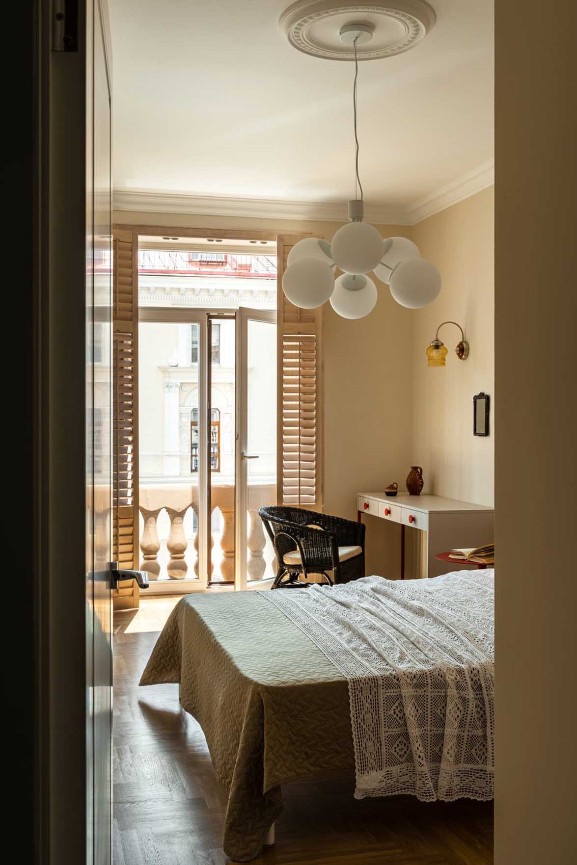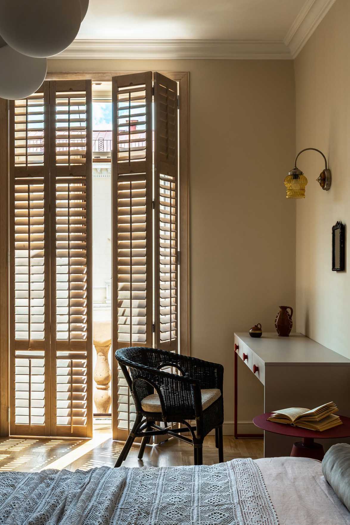 Az ágy fejtámlájának két oldalára restaurált, vintage fali lámpák kerültek, míg a mennyezetet egy letisztult csillár díszíti. A franciaablakot hagyományos függönyök helyett beltéri spalettákkal árnyékolták, ami amellett, hogy remekül hangszigetel, a beáramló fény precíz szabályozását is lehetővé teszi. Az ablakhoz egy asztal és egy fotel került, amely dolgozósarokként is megállja a helyét.