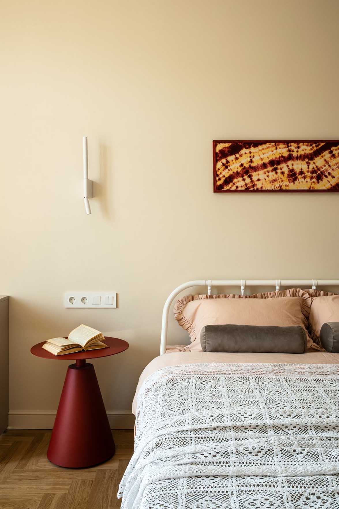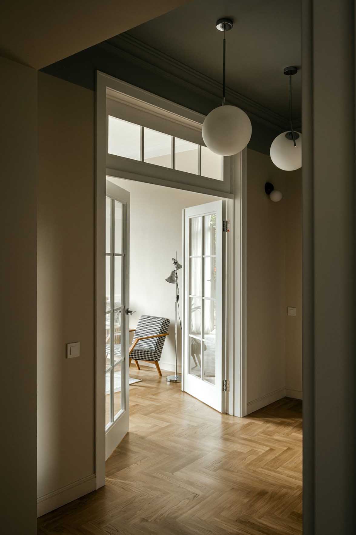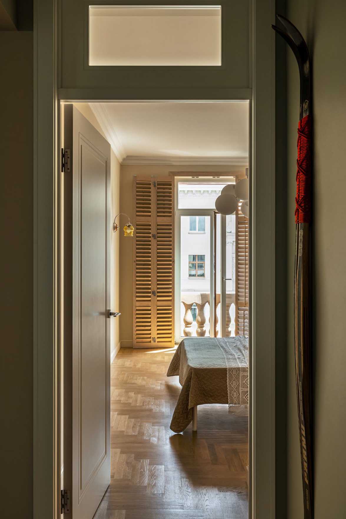 Az ágy fejtámlájának két oldalára restaurált, vintage fali lámpák kerültek, míg a mennyezetet egy letisztult csillár díszíti. A franciaablakot hagyományos függönyök helyett beltéri spalettákkal árnyékolták, ami amellett, hogy remekül hangszigetel, a beáramló fény precíz szabályozását is lehetővé teszi. Az ablakhoz egy asztal és egy fotel került, amely dolgozósarokként is megállja a helyét.