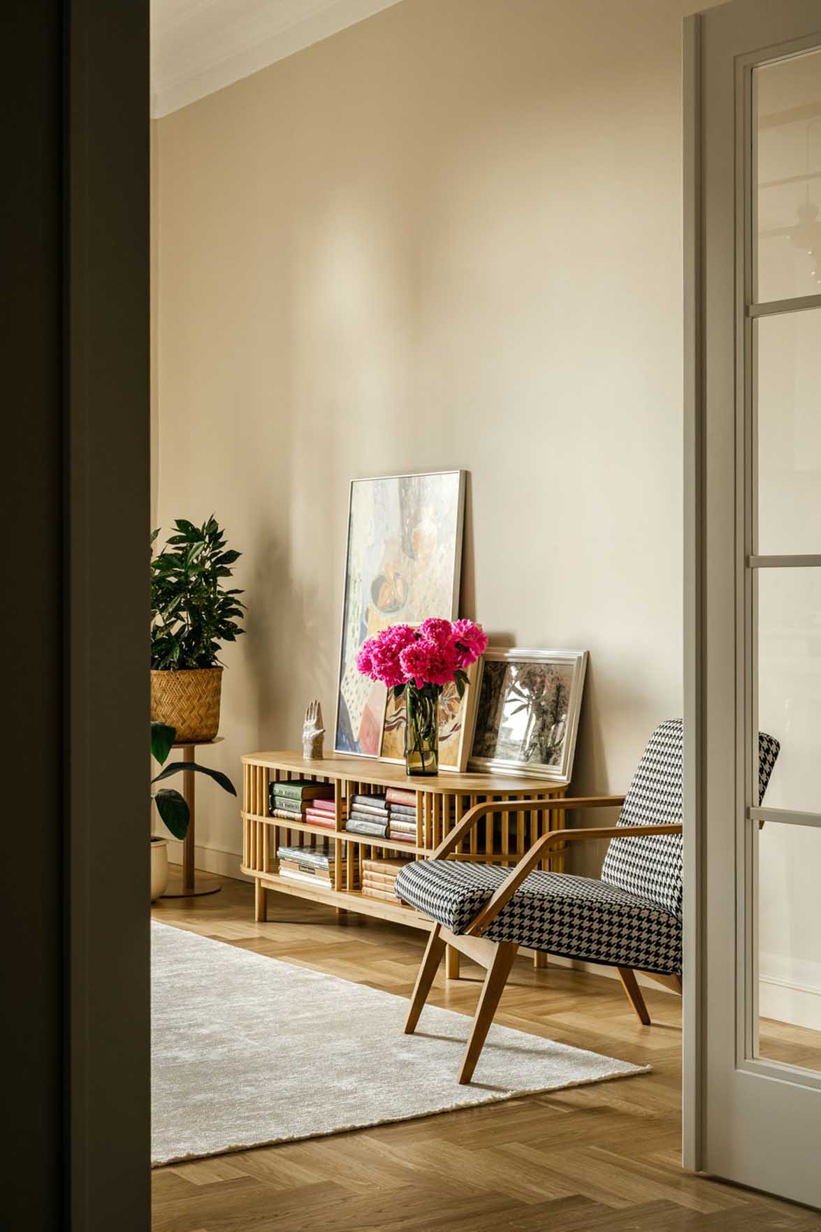 Letisztult burkolatok, fókuszban a művészet és a dekoráció – ebben a csende belső udvarra néző, kétszobás polgári lakásban a természetes anyagokat, klasszikus és kortárs elemeket ötvözte a lakberendező.