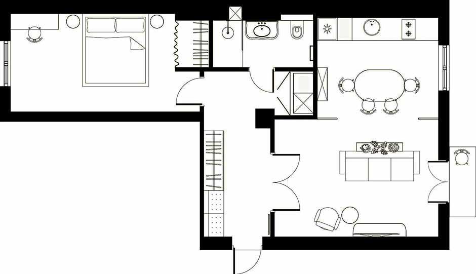 A lakásban átalakították az alaprajzot: egybenyitották a konyhát a nappalival, valamint a fürdőszobát a vécével. Mivel a társasházban már korábban áttértek a gázról az elektromos hálózatra, a konyha és a nappali egybenyitása nem ütközött akadályba.