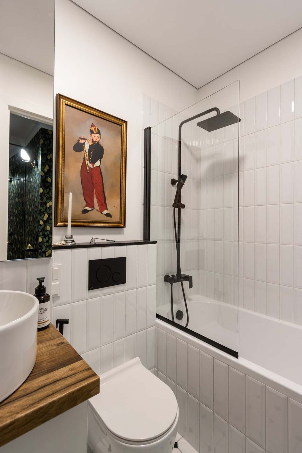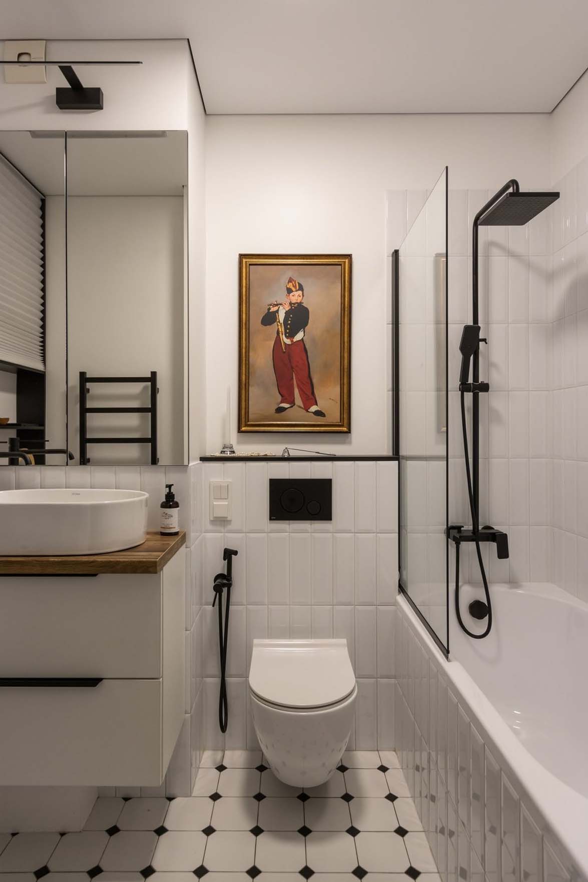 A falakat ragyogó fehér csempe és világos falfesték kombinációja borítja, amely vizuálisan tágítja és frissességgel tölti meg a teret. A padlón a fehér alapot geometrikus, fekete mintázatú lapok törik meg, stílusos és modern kontrasztot teremtve. Izgalmas fókuszpontként szolgál a fali WC fölött elhelyezett festmény, amely egyedi karaktert és egy csipetnyi színt csempész a helyiségbe, megkoronázva annak hangulatát.