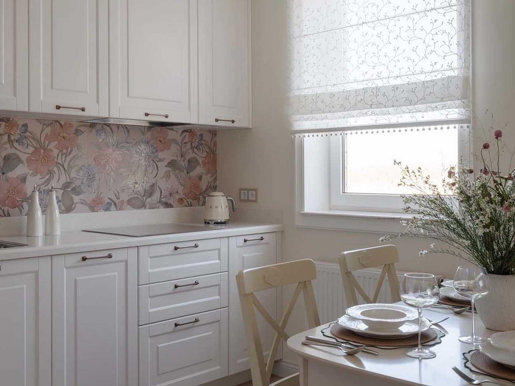 Visszafogott bútor, konyhai hátfal bájos, virágos mintázattal
