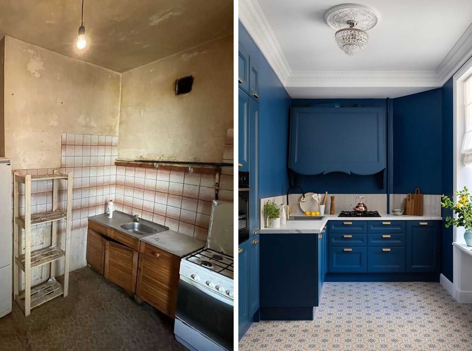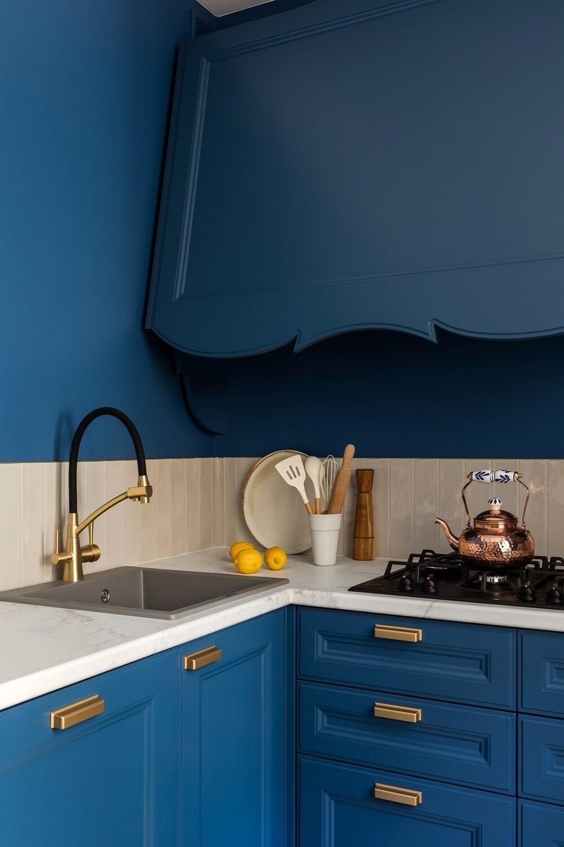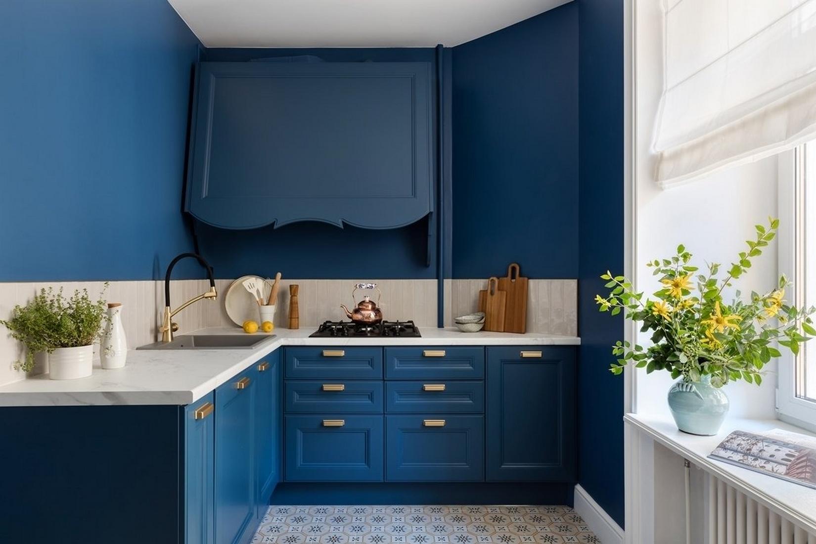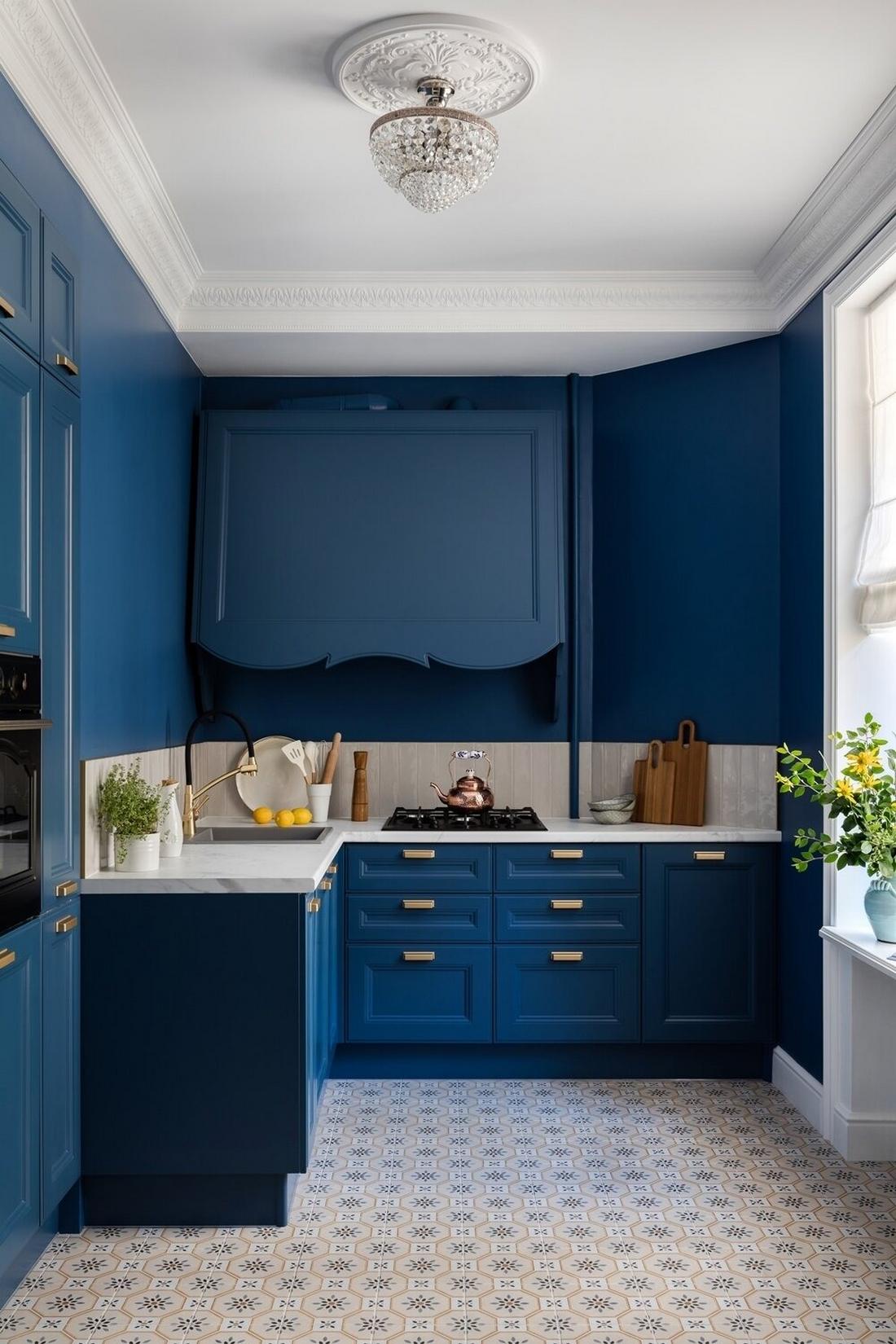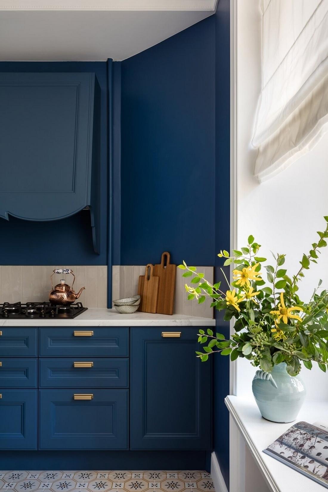 Az ablakok elé fényáteresztő római rolót helyeztek, amely engedi érvényesülni az ablak körül futó díszléceket. A karakteres kék bútor mellett nem szerettek volna hagyományos hátfalat: helyette függőlegesen rakott csempe védi a fal alsó sávját, fölötte a bútor színével egyező árnyalatra festették a falakat. Egy ferde falszakasz is nehezítette a berendezést, a mélykék falak segítenek szinte láthatatlanná tenni a helyiség szabálytalan alakját.