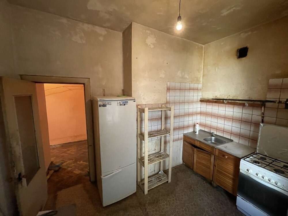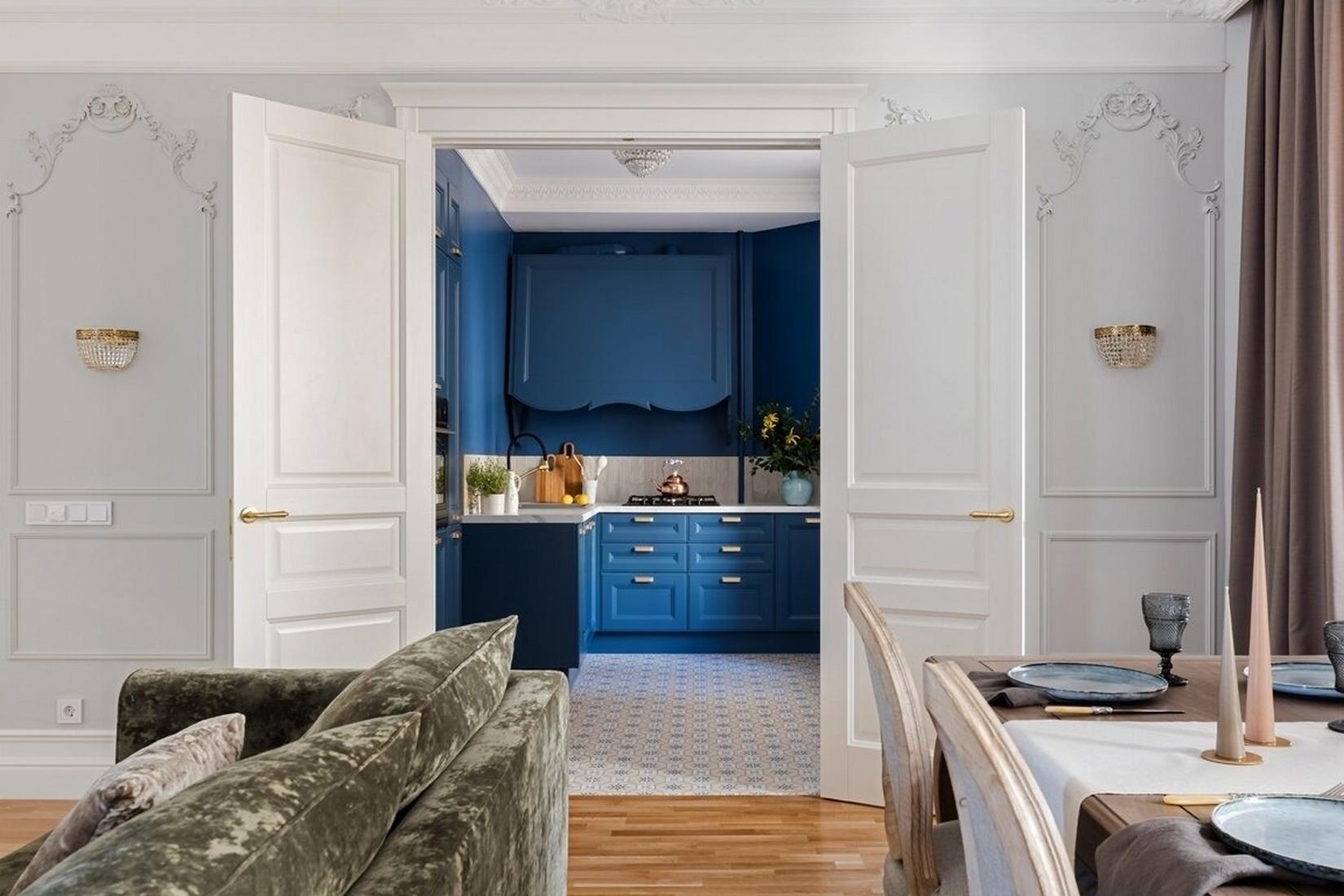 A konyha területe változatlan maradt, csupán a bejárat helyét változtatták meg – a helyiség most a nappaliból nyílik. Az új ajtónyíláshoz gyönyörű kétszárnyú ajtót terveztek, az eredeti ajtó helyén pedig lehetőség nyílt toronyszekrények elhelyezésére.