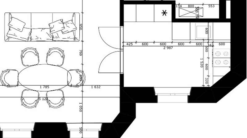 Belvárosi bérházban vásárolt lakást egy fiatal pár, a lerobbant állapot teljes felújítást igényelt. A konyha átalakítását is dizájnját alaposan át kellett gondolni, mert a lakás elosztását is szerették volna kényelmesebbre hangolni, és a konyha nem szabályos alakja is nehezítette a berendezést.