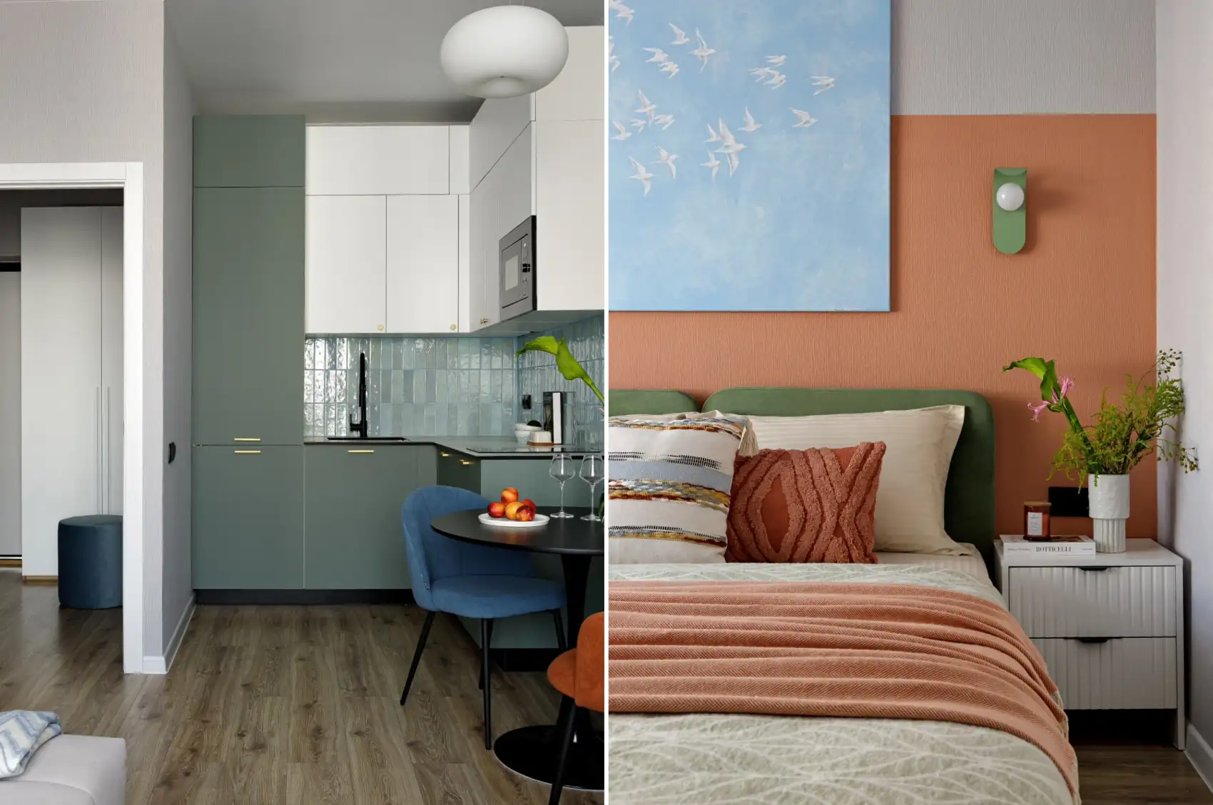 Egy pár közös, kis alapterületű otthonának kialakítása mindig többről szól, mint a helytakarékosságról. Két ember igényeit kell úgy összehangolni, hogy a lakás ne legyen túlzsúfolt, mégis minden fontos funkció helyet kapjon: legyen elég tárolás, kényelmes közös nappali zóna, használható étkező, nyugodt háló és praktikus fürdő. A képeken látható enteriőr ennek egy átgondolt, mai megoldását mutatja. A visszafogott szürkés alaphoz zöld, kék és terrakotta hangsúlyok társulnak, a bútorozás pedig következetesen a tiszta vonalakra, a lebegő elemekre és a vizuálisan könnyű arányokra épít. Az eredmény nem látványosan túlgondolt, hanem jól lakható: karakteres, de mértéktartó, kis alapterületen is rendezett és élhető.