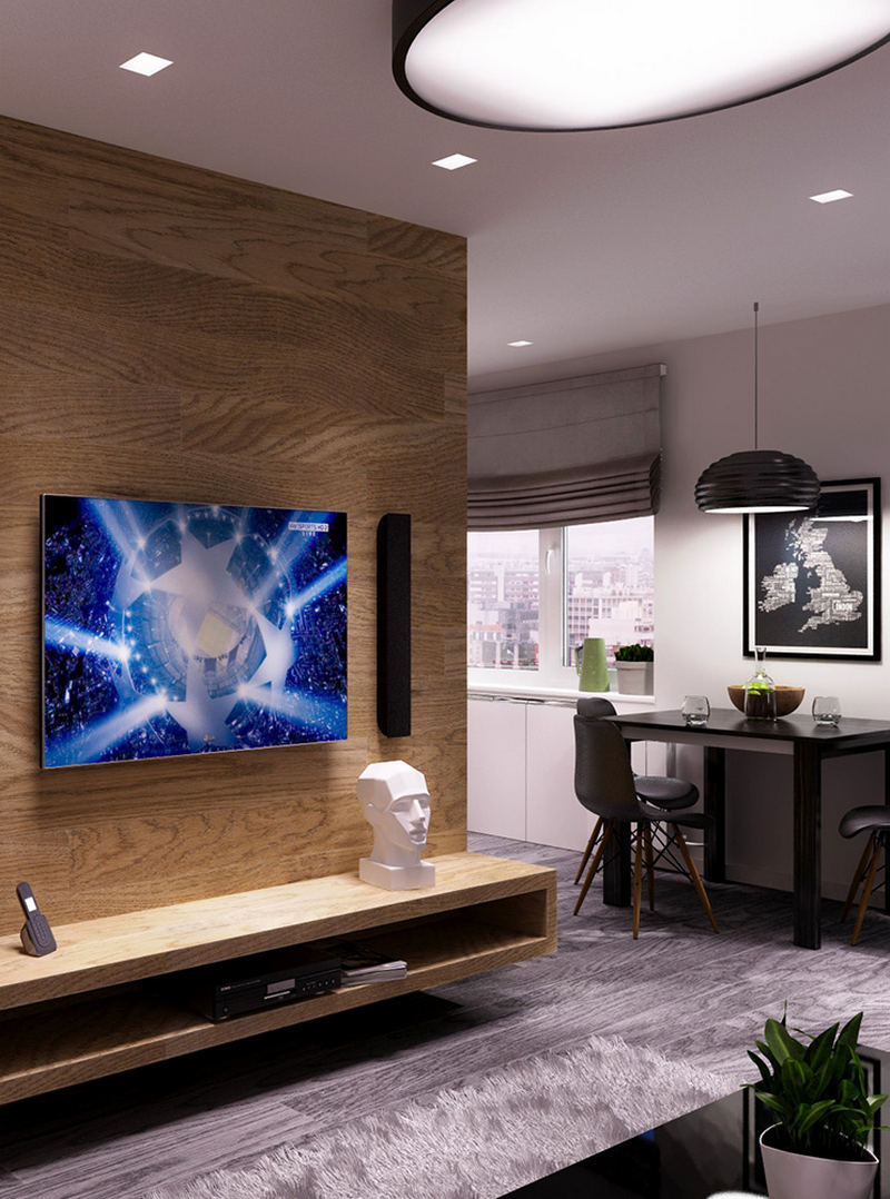 Letisztult, modern, funkcionális teret tervezett a lakberendező egy fiatal férfi részére, ahol egy személynek minden kényelmi elem megtalálható a kis alapterület ellenére is, nappali, dolgozósarok, étkező, konyha, kis gardróbszoba, fürdő, tárolóhelyek. A berendezés minimál hangulatú természetes fa elemekkel mint a szürkés padló vagy a lakás terében szinte különálló tömböt képező fa “kocka”.