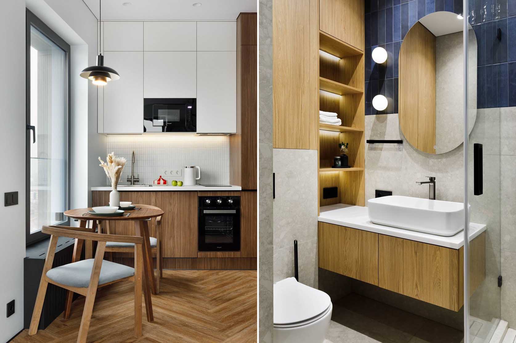 - Rétegezett világítás: süllyesztett mennyezeti spotok, konyhai pultvilágítás, polcmegvilágítás és fürdő fali lámpák. A külön kapcsolható fényekkel ugyanaz a kis tér több használati helyzethez igazítható.