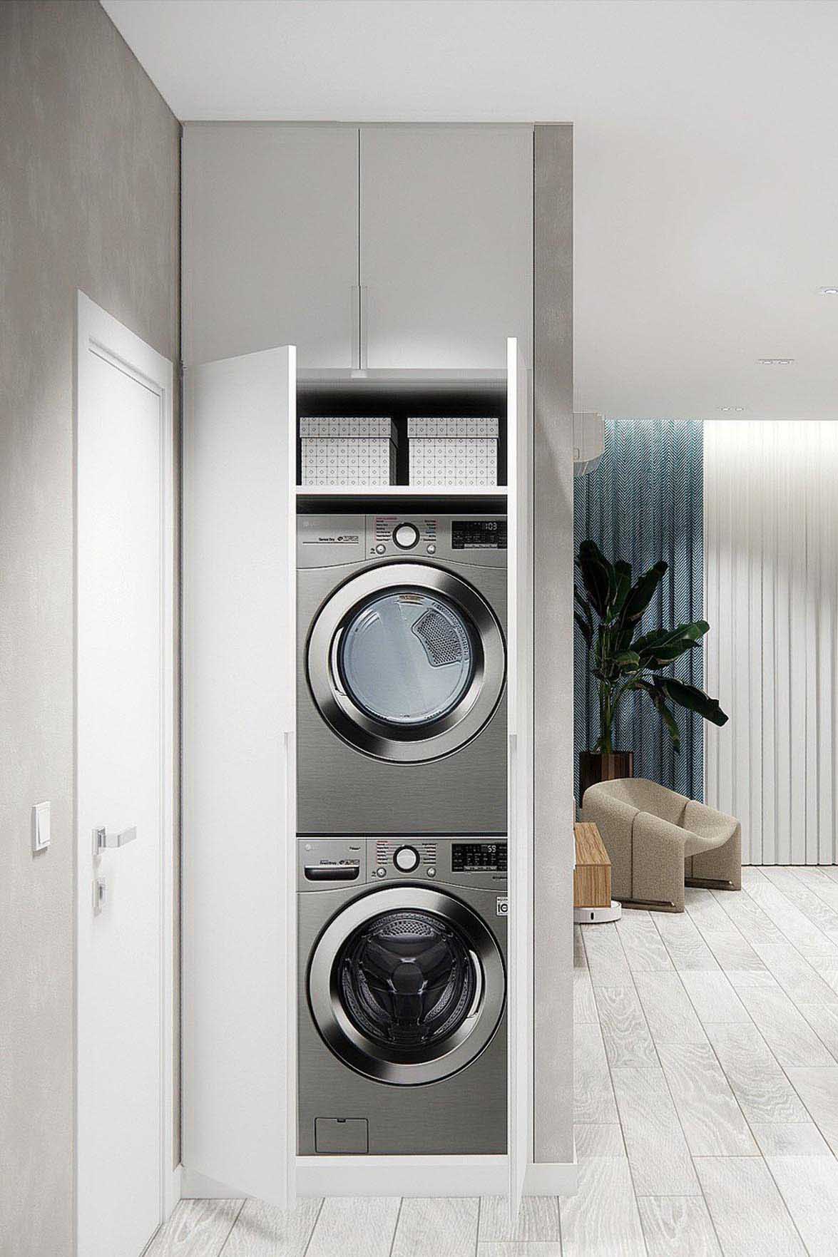 Kompakt, de rendkívül funkcionális előtér fogadja az érkezőt. A tárolást egy beépített szekrény és egy háztartási blokk oldja meg: a mosó- és szárítógépet, valamint a takarító eszközöket diszkrét frontok mögé rejtették, így a lakás rendje könnyen fenntartható. A padlón az egész lakáson átívelő, küszöbmentes vinyl burkolat fut, amely vízálló tulajdonságaival és magas kopásállóságával a robotporszívók számára is akadálymentes terepet biztosít.