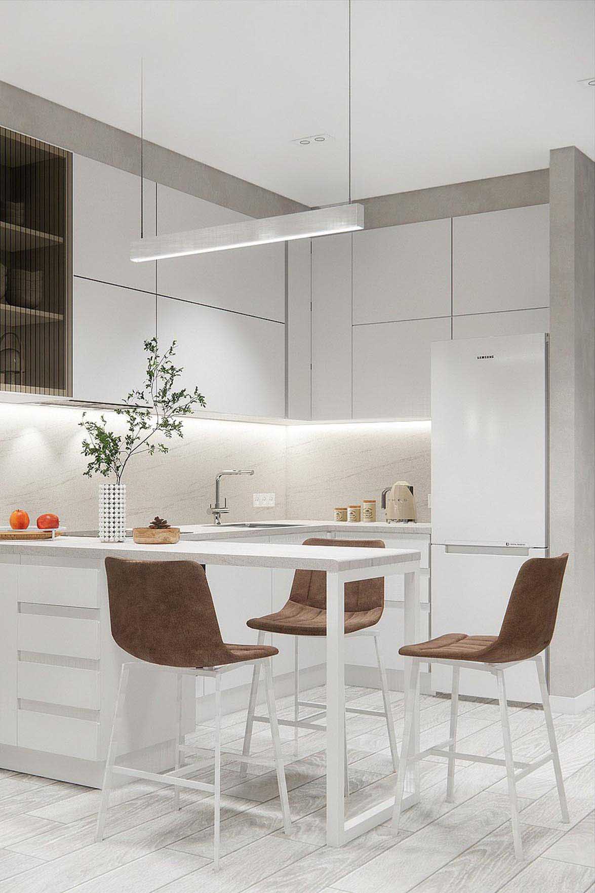 A nappali és a konyha térben a falakat nagy kopásállóságú, mosható dekorvakolat borítja, amely finom textúrájával emeli a tér fényét. A konyhában a hagyományos étkezőasztalt egy elegáns, fémlábakon nyugvó pultmegoldás váltotta fel, amely reggelizőként és munkafelületként is kiválóan funkcionál. A konyhai hátfal és a nappali bizonyos szakaszai fehér gipsz falpanelekkel kaptak ritmust, ami vizuálisan megnyújtja a belmagasságot.