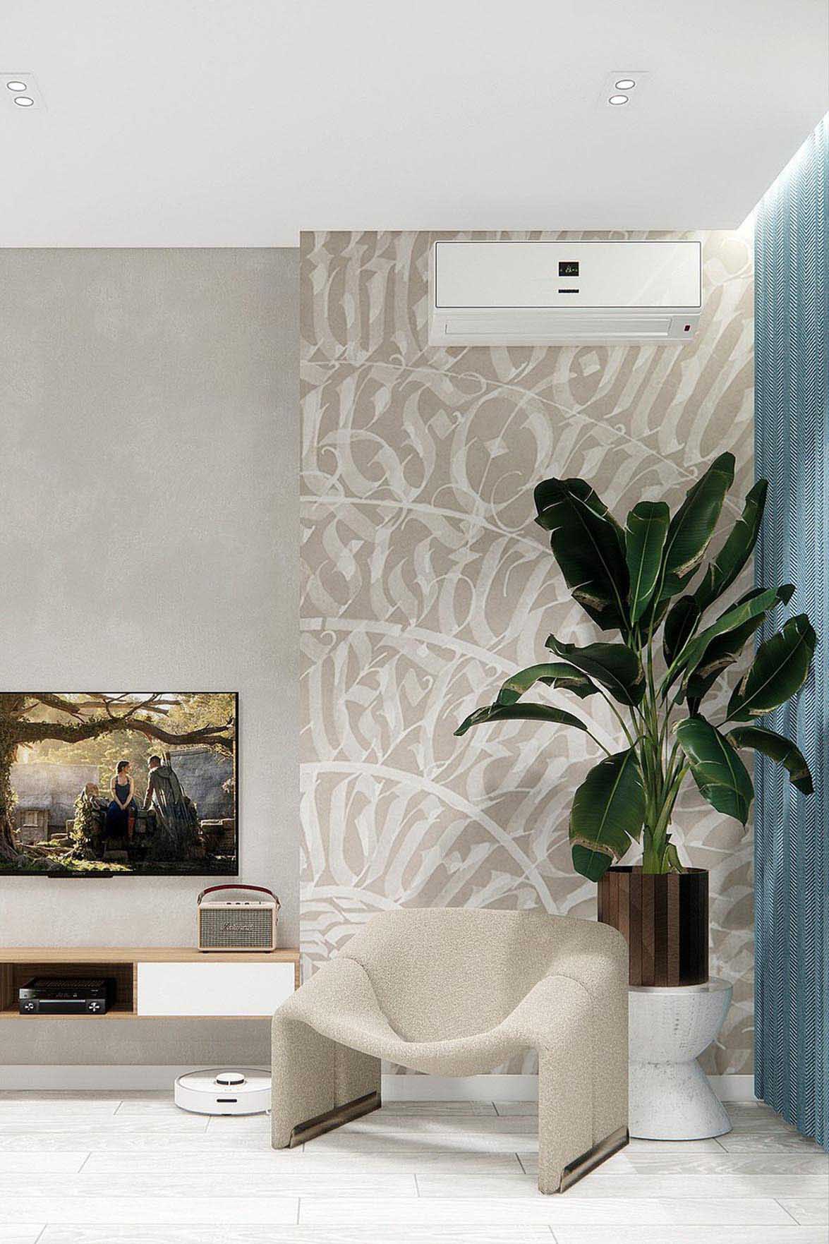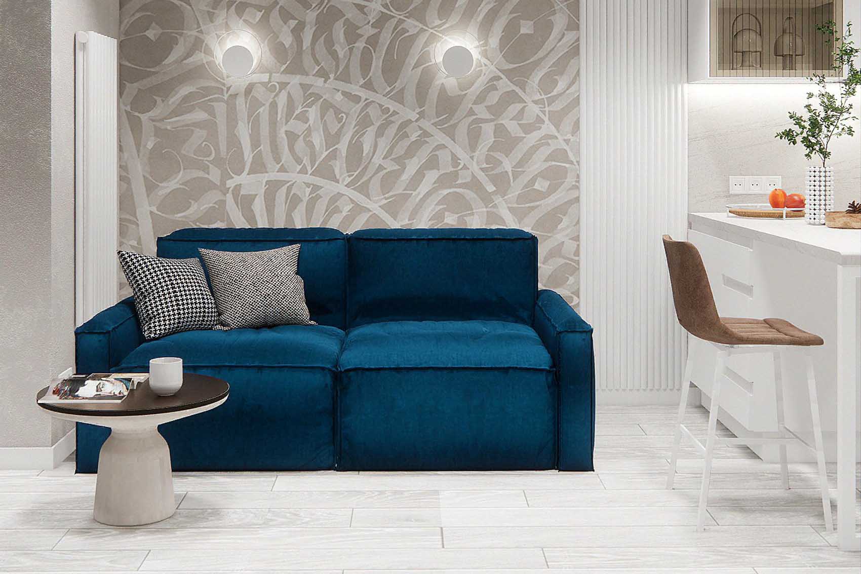 A nappali zóna leglátványosabb eleme a két szemközti falon megjelenő, kalligrafikus mintázatú egyedi falpanel, amely művészi mélységet ad a térnek. A kényelmet egy mélykék, moduláris kialakítású kanapé szolgálja, amely vendégágyként is funkcionál, így a lakás rugalmasan alkalmazkodik a vendégfogadáshoz.