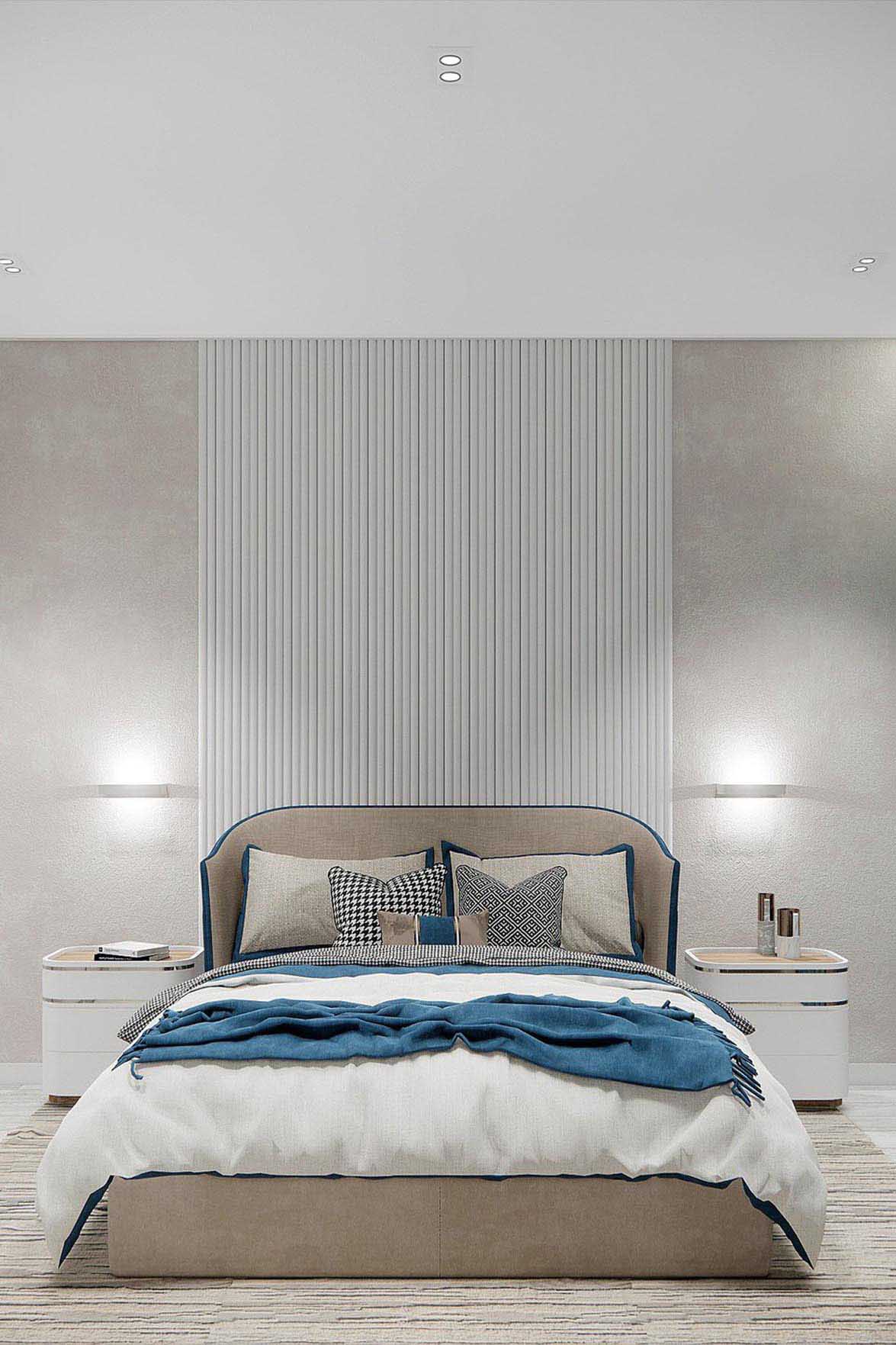 A hálószobában a konyhánál megismert függőleges vonalvezetésű 3D panelek köszönnek vissza az ágytámla mögött, egységes stílust teremtve. A nagyméretű, egyedi gyártású franciaágy mellett nagy gardróbszekrény biztosítja a személyes tárgyak elhelyezését. A világítás itt lágyabb, több rétegű, elősegítve zavartalan a pihenést.