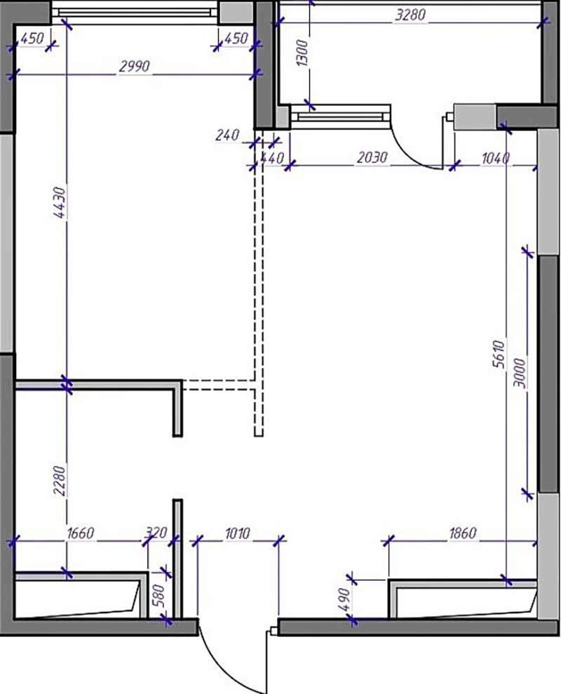 Az ingatlan eredetileg szerkezetkész, nyitott terekkel rendelkező állapotban került a tervezőhöz, ami lehetővé tette a válaszfalak stratégiai elhelyezését. A funkcionális zónák kialakításakor a cél a természetes fény maximális kihasználása volt. A végeredmény egy logikus elosztás: tágas konyha-nappali közösségi tér, egy intim, különálló hálószoba, egy praktikus előszoba és egy minden igényt kielégítő fürdőszoba született.