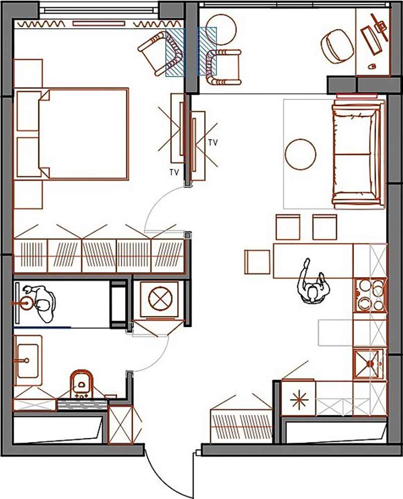 A modern nagyvárosi lét megköveteli a rugalmasságot, a nyugalmat és a kompromisszummentes kényelmet. Ebben a 43 négyzetméteres lakásban a tervező ügyesen ötvözte a világos, tágas térérzetet a karakteres kék kontrasztokkal, egy olyan életteret hozva létre, amely ideális menedék a tulajdonos, egy dinamikus életvitelű fiatal szakember számára.