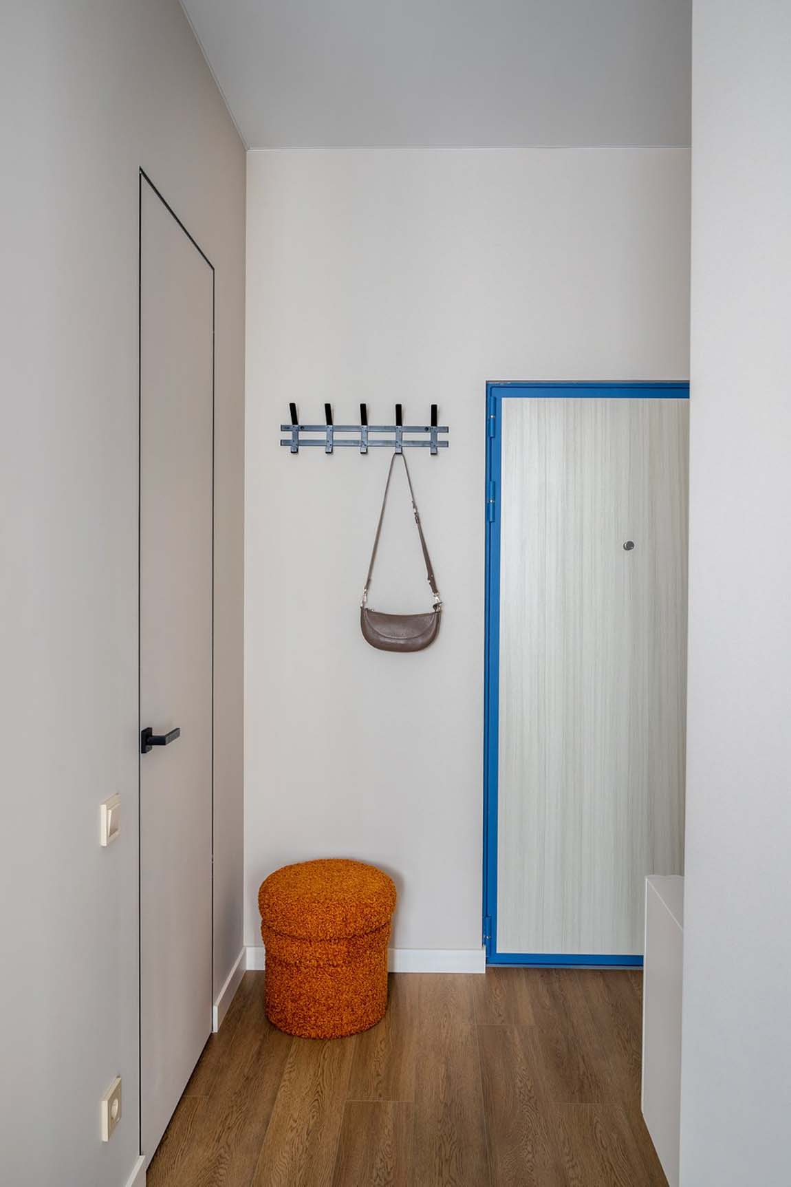 Az előszobában a bejárati ajtó élénkkékre festett kerete határozott vizuális jelként működik, mellette a fogas és a narancsos, buklé hatású puff egyszerre praktikus és könnyen variálható hangulati elem.