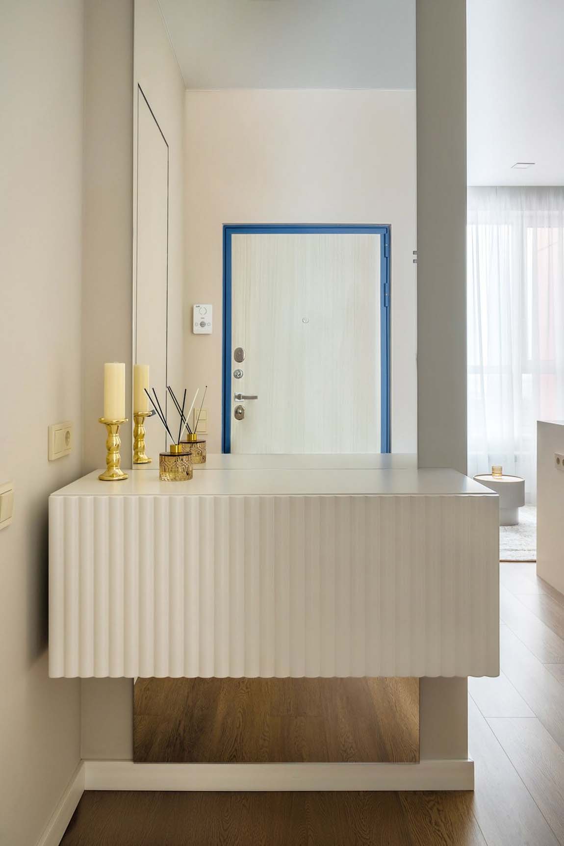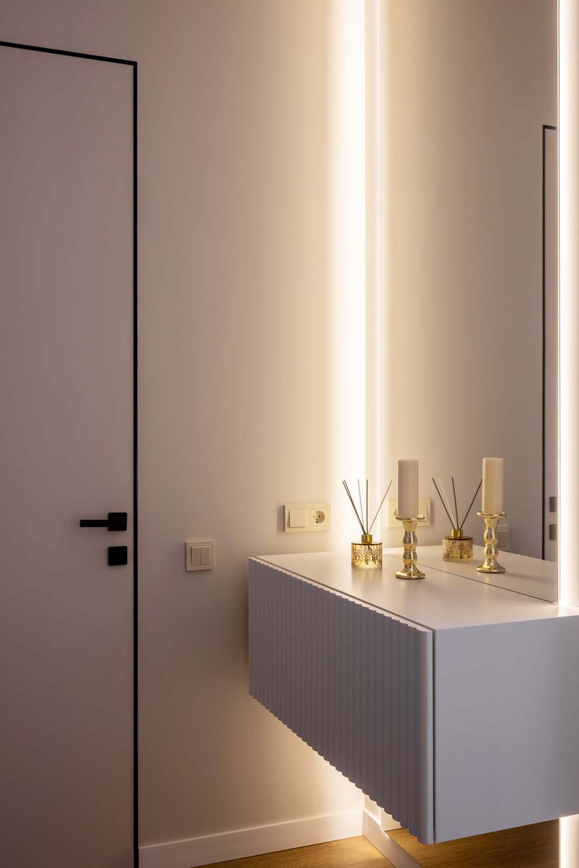 A közlekedőben elhelyezett konzolasztal ötletes megoldás. A bordázott frontú, lebegő hatású bútor praktikus lerakófelület és vizuális fókuszpont, a mögötte elhelyezett magas tükör pedig mélységet ad a szűk térnek.