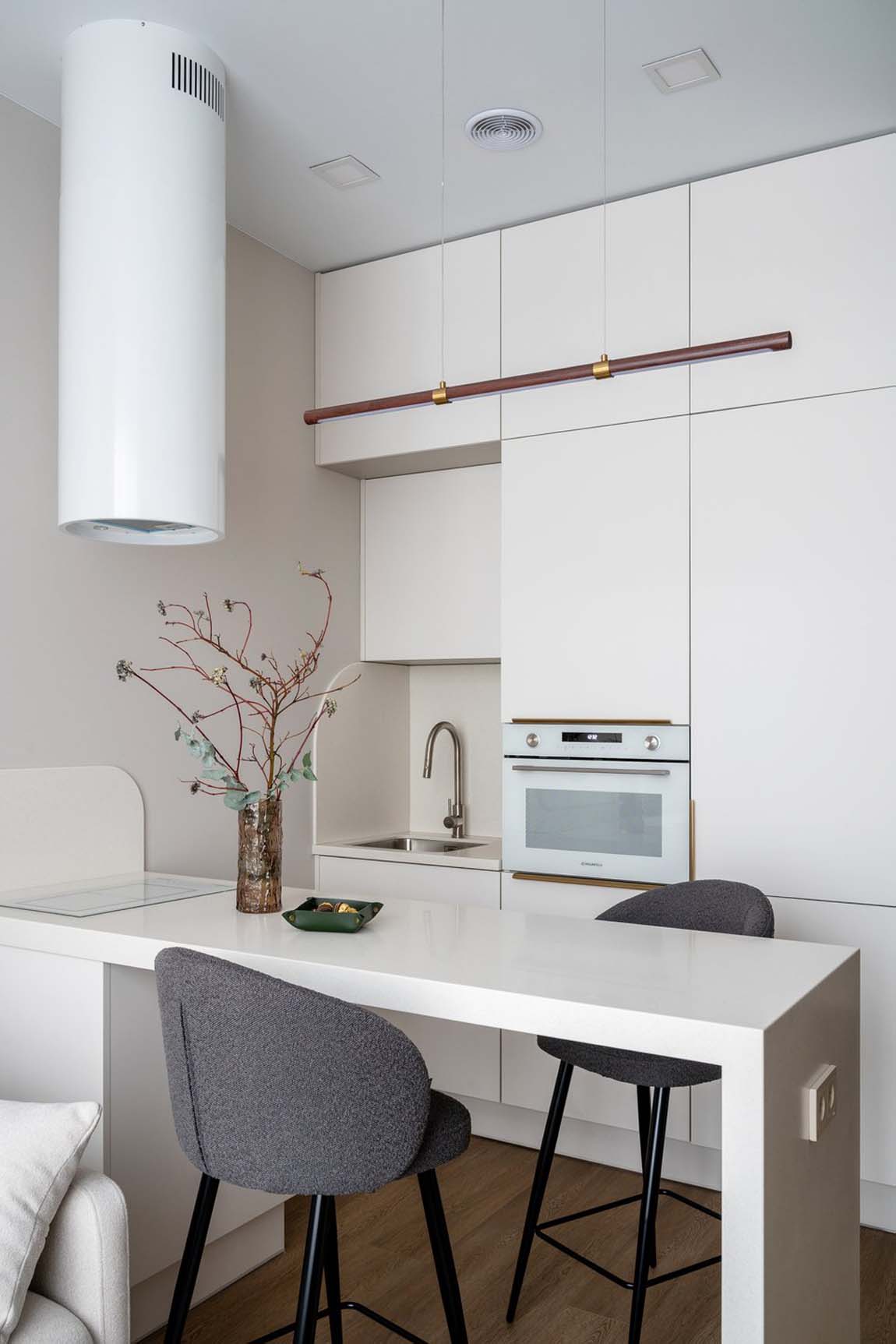 A konyha–nappali zóna központi eleme a multifunkciós sziget, amely egyszerre szolgál munkapultként és étkezőasztalként. A főzőlap a szigetre került, fölötte pedig egy hengeres, mennyezetről függesztett páraelszívó jelenik meg, amely látványos dizájnelemként is kijelöli a konyhai funkciót.