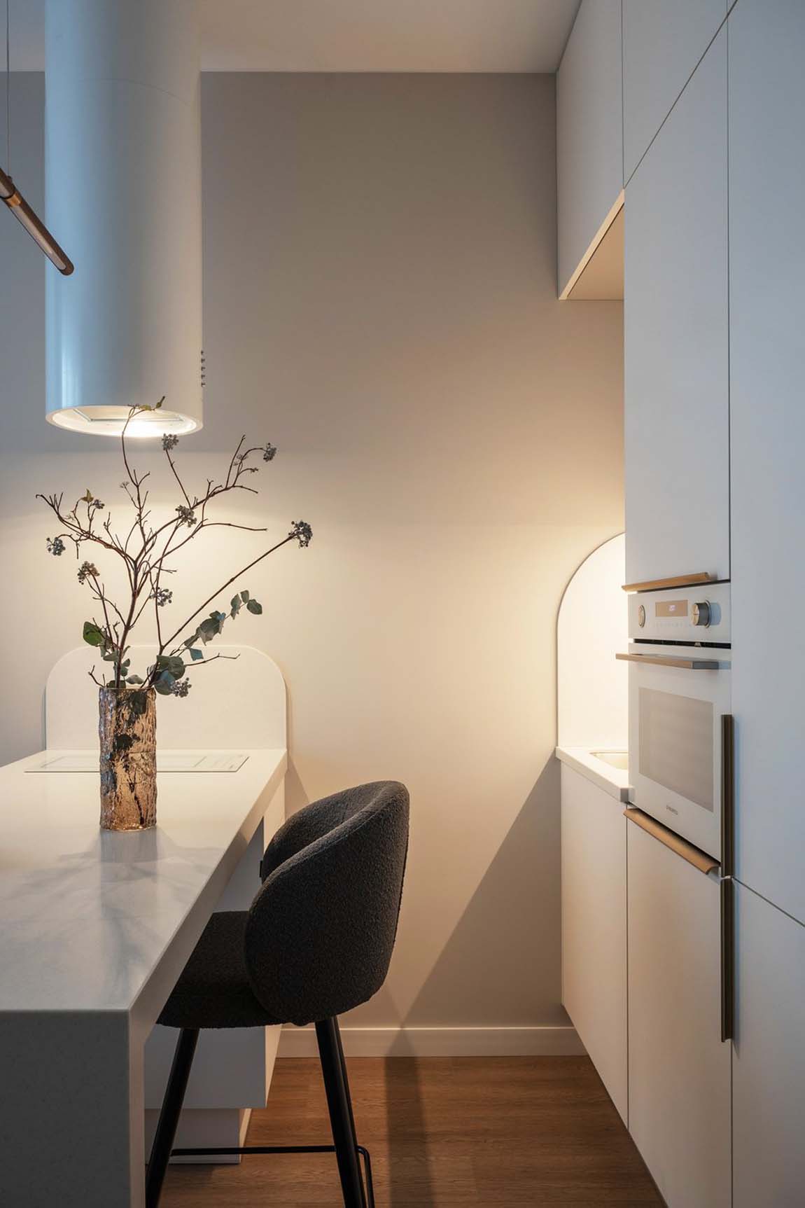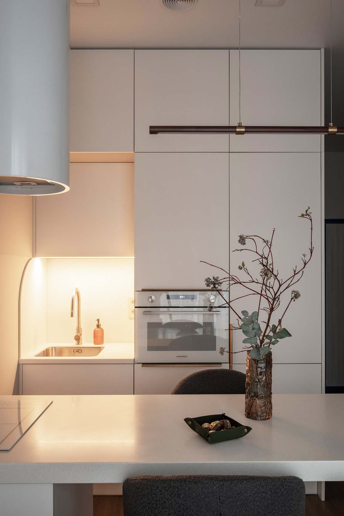 A tervezés szerkezetkész állapotból, „üres papírról” indult, így a zónák kialakításánál nem kellett kényszerű kompromisszumokat kötni. A hálószoba bejárata a közlekedő helyett a konyha–nappali tengely felől nyílik, aminek köszönhetően az előszoba és a folyosó funkciója tisztábbá, rendezettebbé vált. A tárolás kiemelt figyelmet kapott: bár a lakás több pontján is nagyméretű beépített szekrények kaptak helyet, az összkép mégis levegős maradt. Ez részben a világos felületeknek, részben pedig a síkba simuló, homogén bútorfrontoknak köszönhető.