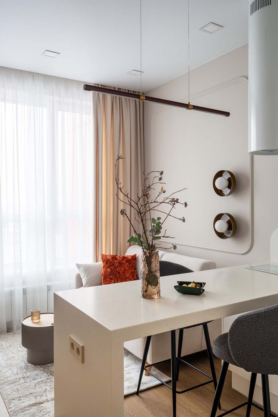 Ez a 36 négyzetméteres otthon tudatosan az „univerzális” irányba mozdul el: a tulajdonos hölgy kifejezett célja volt az érték- és időtálló berendezés. A tervező olyan enteriőrt alkotott, amely egyszerre könnyen kezelhető, jól tisztán tartható, mégis elég karakteres ahhoz, hogy a későbbi eladás során könnyen vevőre találjon. A koncepció kulcsa a fegyelmezett színpaletta, a bőséges, mégis rejtett tárolás, valamint a „finom díszítés”, amely nem tárgyakból, hanem textúrákból, fényekből és ritmusból építkezik.