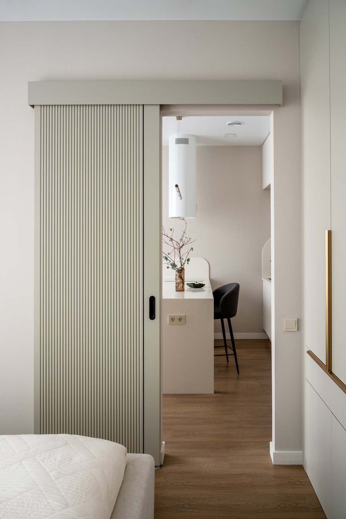 A háló és a nappali közötti bordázott tolóajtó szintén helytakarékos választás, textúrája pedig visszaköszön a lakás több pontján (a konzolasztalon és a falpanelen). Ez az ismétlődés a kis lakások nagy barátja: egységes, rendezett érzetet kelt még kevés bútor mellett is.