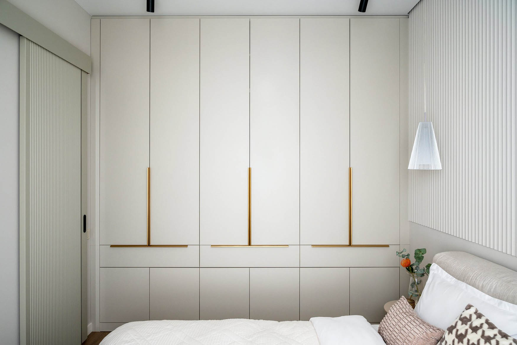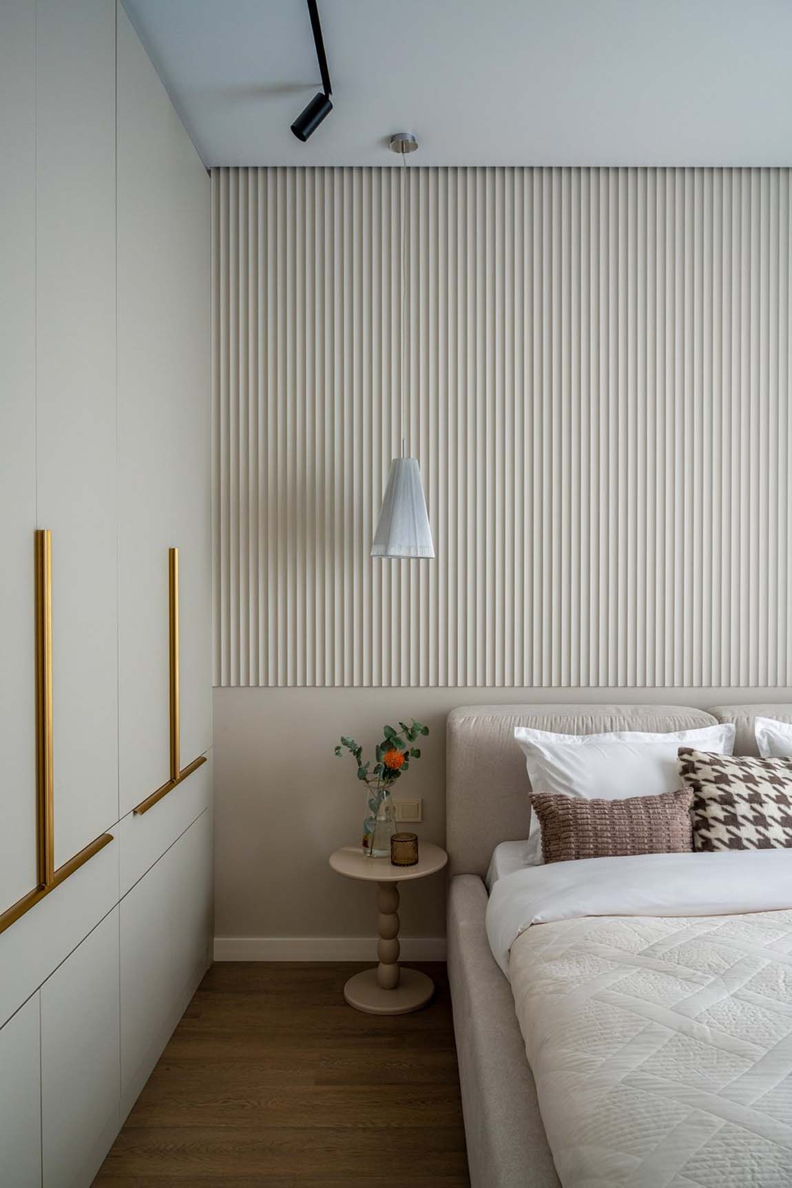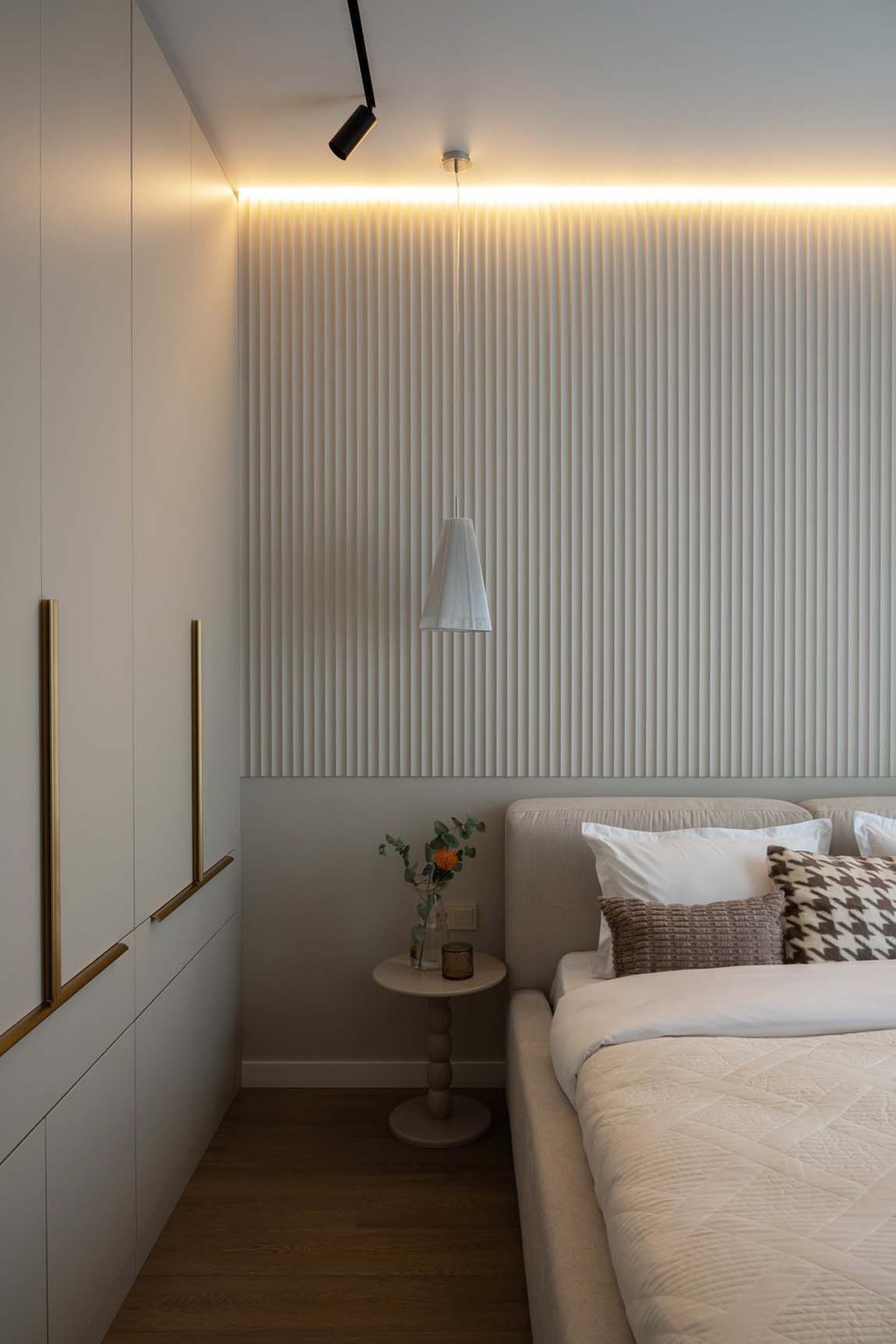 A hálószoba a tárolásról szól, de nyomasztó zsúfoltság nélkül. A teljes falfelületet kitöltő, egyedi gyártású szekrényfrontok egységes síkot alkotnak, amit a hosszú, aranyszínű fogantyúk grafikus ritmusa tör meg. Az ágy mögött megjelenő bordázott falpanel és a rejtett fénycsík tovább erősíti a letisztult, pihentető atmoszférát. A világítás itt építészeti elem, ami alacsony belmagasságnál vagy kis alapterületnél különösen előnyös, mert nem „ül rá” a térre.
