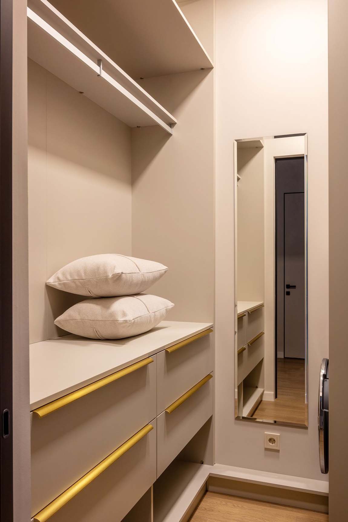 Ami mindig sokat hozzáad egy kis alapterületű lakás értékéhez: a lakás bejáratánál egy tágas, egyedi gyártású gardróbot alakítottak ki átgondolt tárolási rendszerrel: vannak alsó polcok a cipőknek, felettük kihúzható fiókok apró tárgyaknak, ezek felett pedig ruhaakasztó rudak találhatók. A felső rész tökéletes bőröndök, takarók és egyéb ritkán használt tárgyak tárolására.